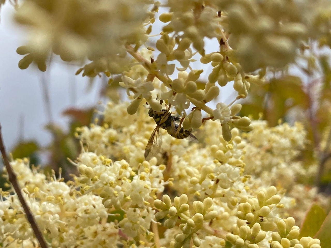 Much to my frustration, a Yellowjacket-like insect is foraging on the flowers on the higher branches of the Tree Privet, out of my reach. From its behavior, I gather that it is not a Yellowjacket wasp, but its deadringer, the Interrupted Hornet Fly, Spilomyia interrupta (family Syrphidae).