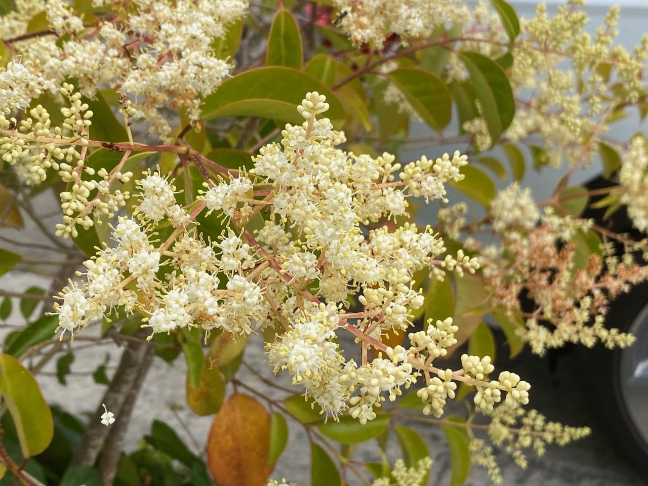 A Tree Privet, Ligustrum lucidum (family Oleaceae) is blooming profusely on a sidewalk strip. From a distance it resembles our native Ocean Spray, Holodiscus discolor in the structural arrangements of its inflorescence.