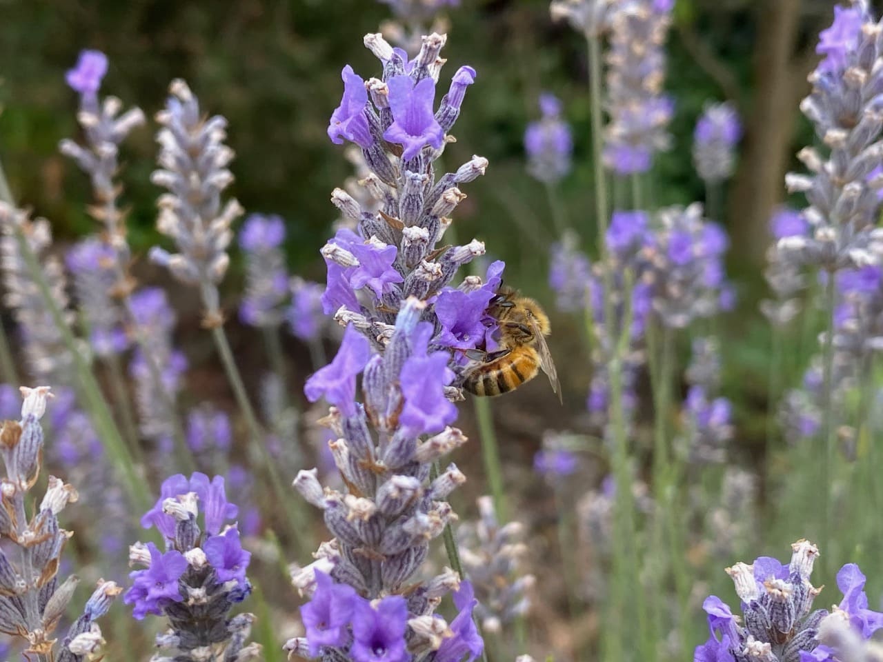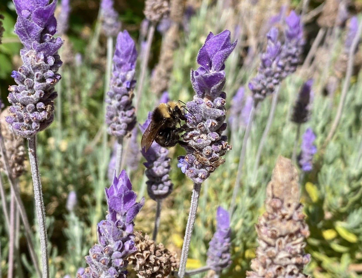 Numerous male Summer Longhorn Bees, Melissodes sp. (family Apidae) are visiting the lavender flowers, but mostly the dried spikes. I wonder why? The bees would land further down on the spike and make their way up quickly before flying away to another spike. Are they scent-marking?