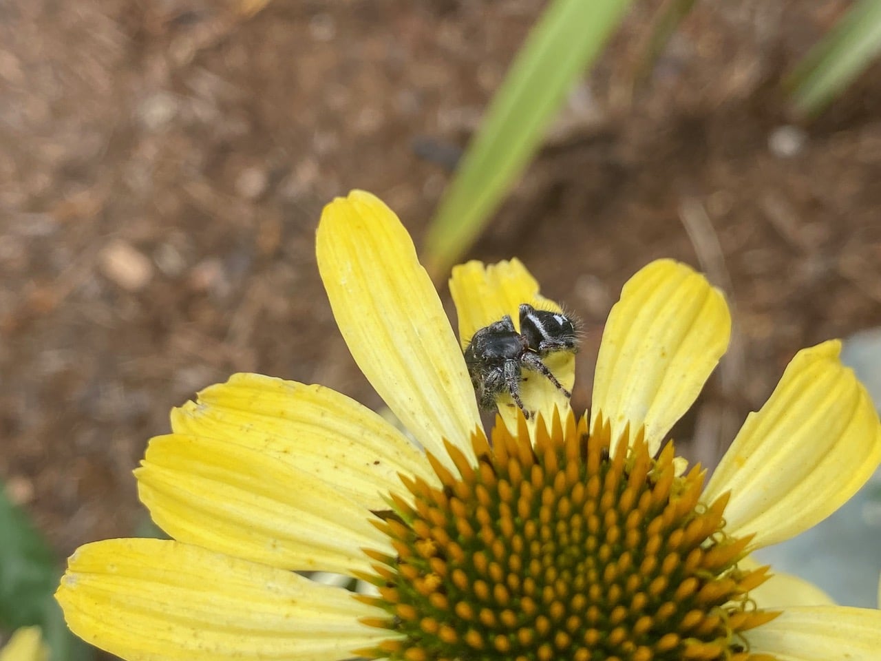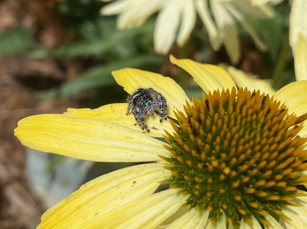 A large black Jumping Spider (family Salticidae) is lurking on a ray petal of an unidentified Asteraceae flowerhead.