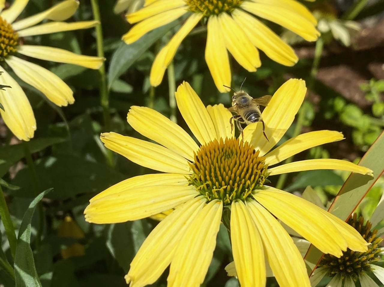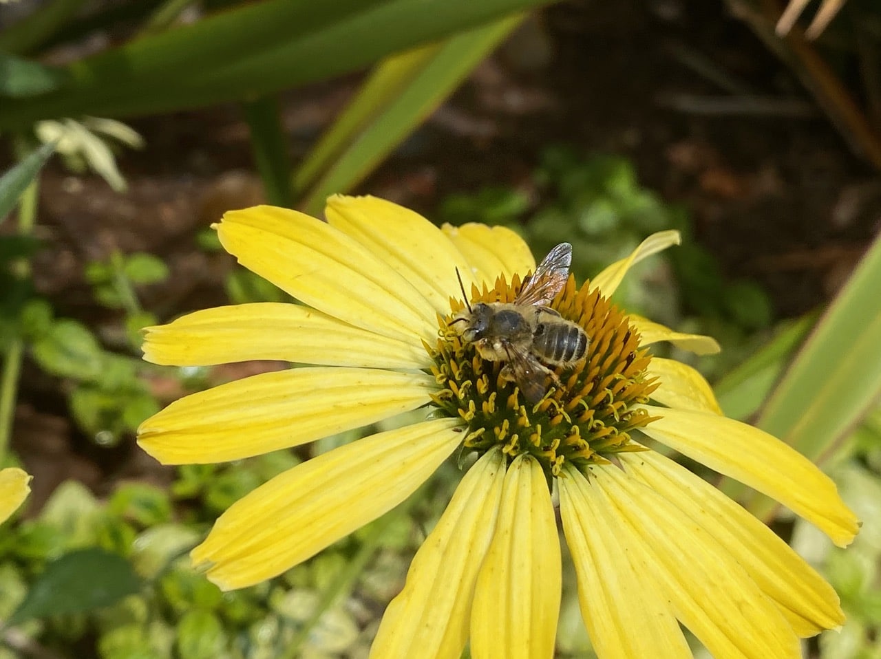 The Summer Longhorn Bees, Melissodes sp. (family Apidae) are medium to large bees, stout-bodied, usually with gray/brown hair on the thorax and pale hair bands on the abdomen. Males usually have yellow markings on their faces and have very long antennae from which their common name is derived. They are active May to September, with peak flight in late June to early August. The females prefer flat, bare ground for digging their solitary nests, though they sometimes nest in aggregations. Pollen is transported in scopae on the hind legs. Pollen loads are often copious and brightly colored and thus very distinguishable. Melissodes are specialists on Asteraceae – females gather pollen from flowers of Aster, Bidens, Coreopsis, Cosmos, Encelia, Gaillardia, Helianthus, and Rudbeckia ssp.