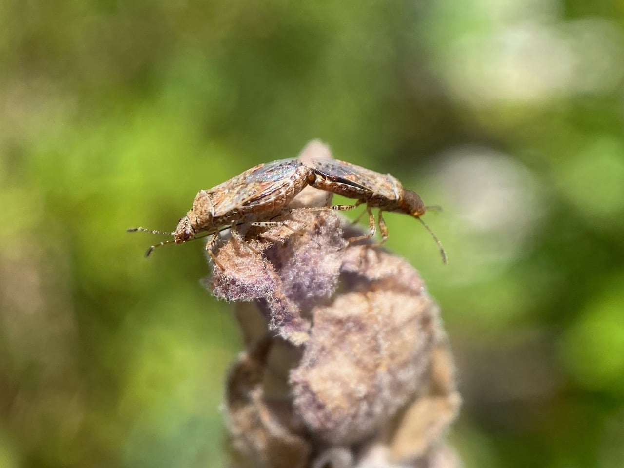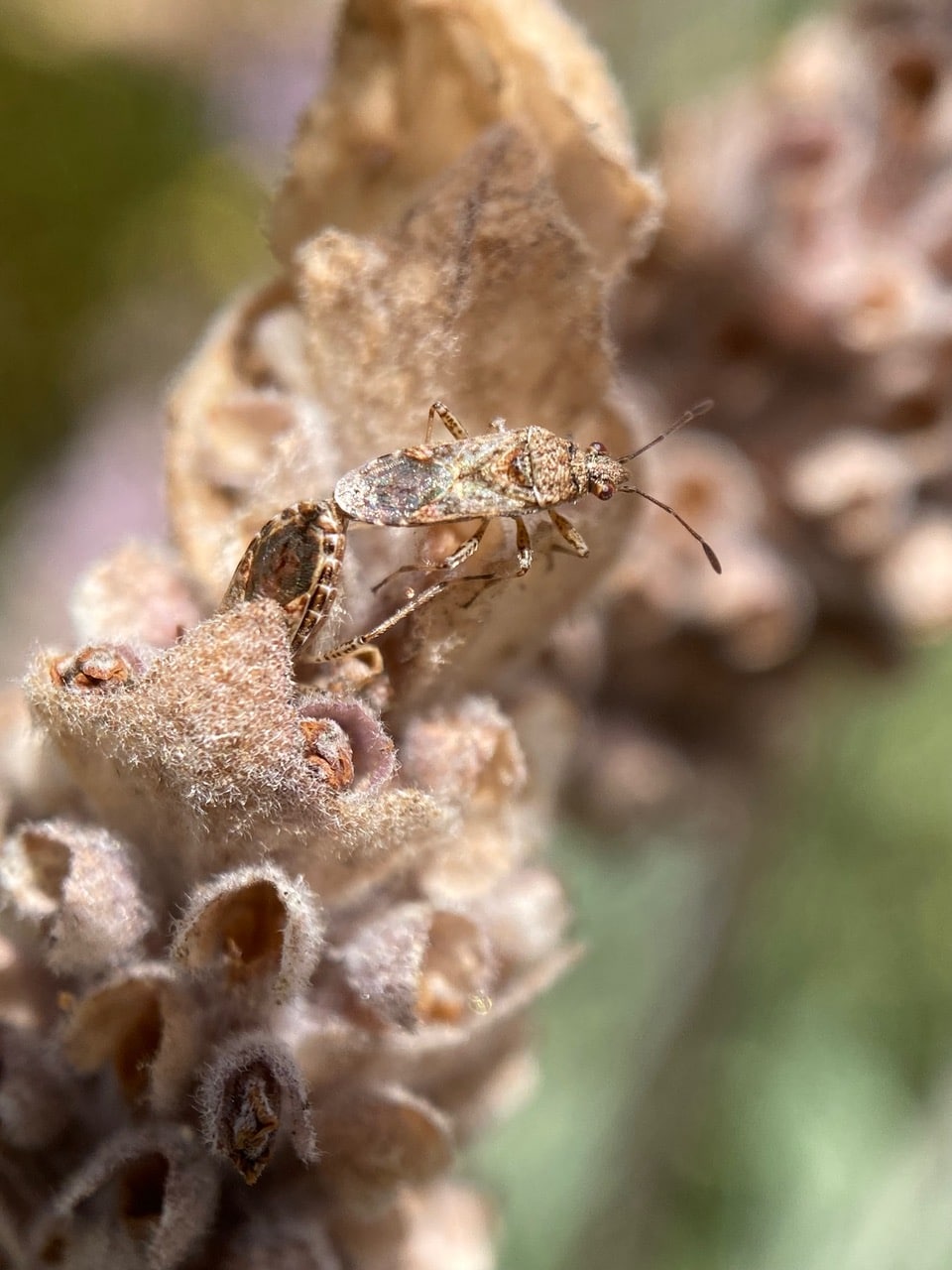 It takes me a while to see these tiny bugs on the dried lavender flower spikes. This is a mating pair, with the larger female half hidden in the seed pods. iNaturalist has helped identify the bugs as Scentless Plant Bugs, Arhyssus sp.(family Rhopalidae). It’s no wonder that they are here – these bugs are seed eaters.
