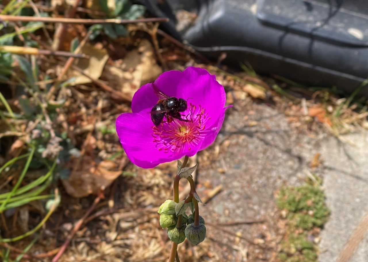 The very first insect that crosses my path on the sidewalk is a large, glossy bee that is collecting red pollen from the brilliant magenta flowers of Calandrinia. It is a female Foothill Carpenter Bee, Xylocopa tabaniformis ssp. orpifex (family Apidae).