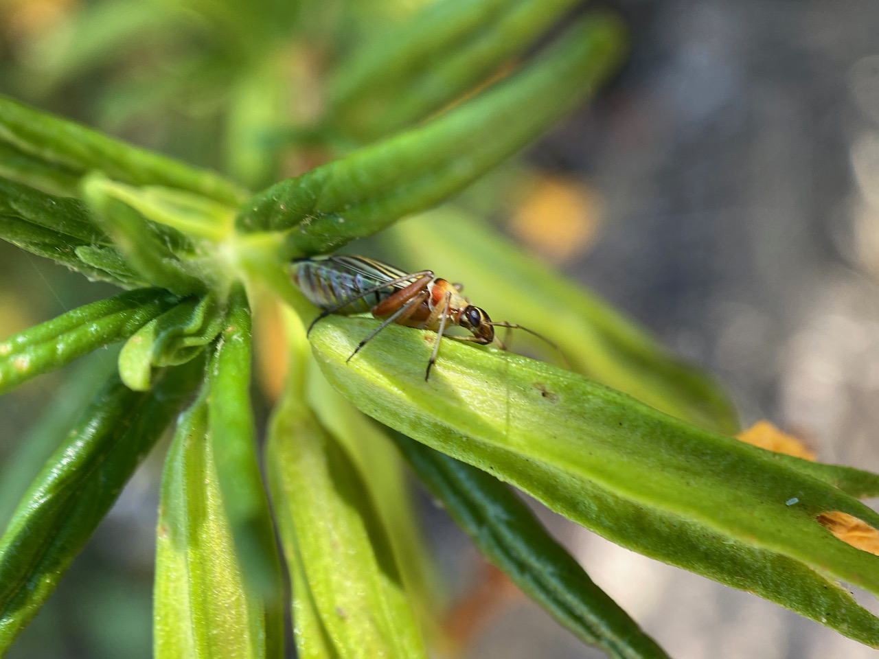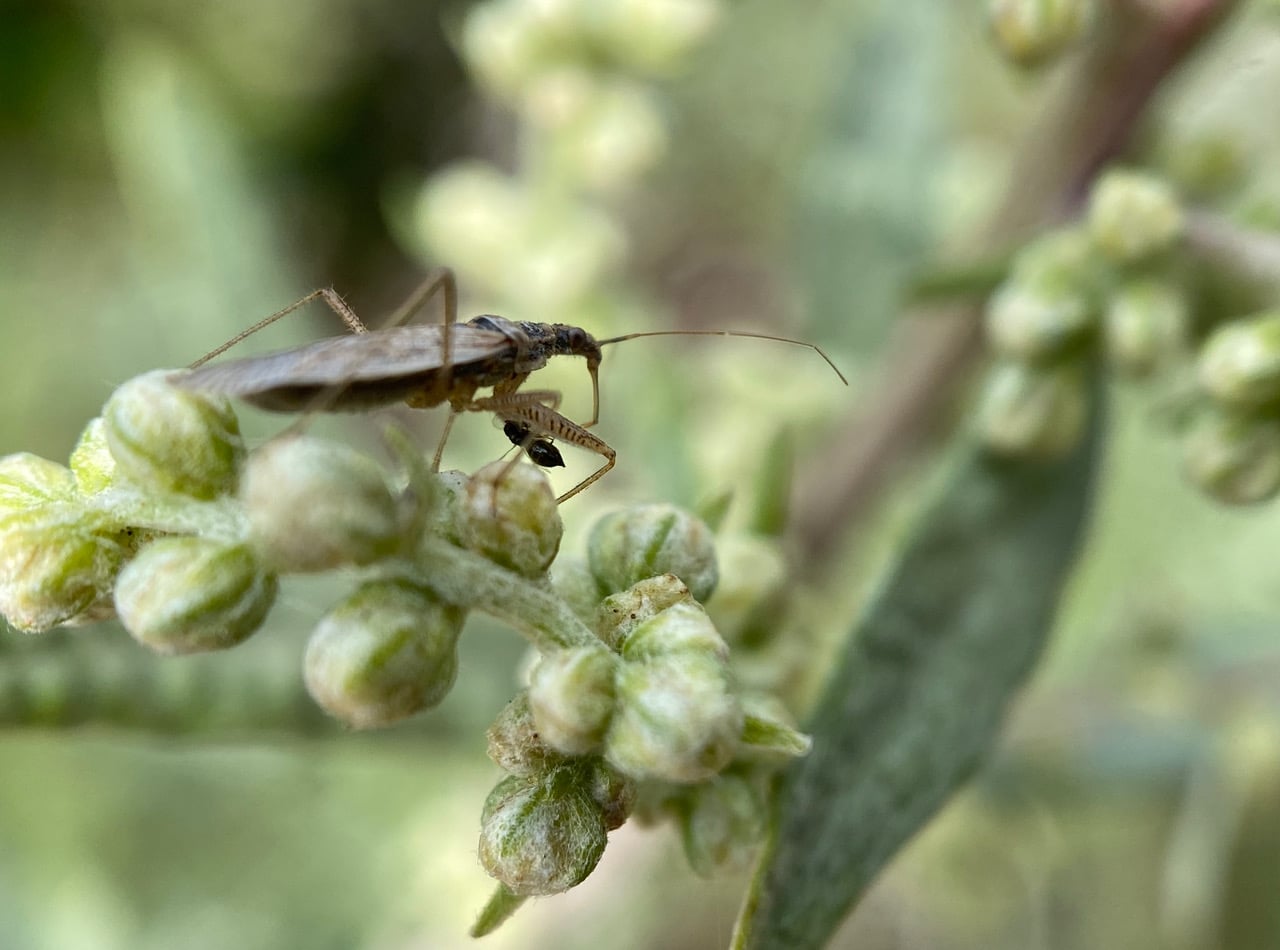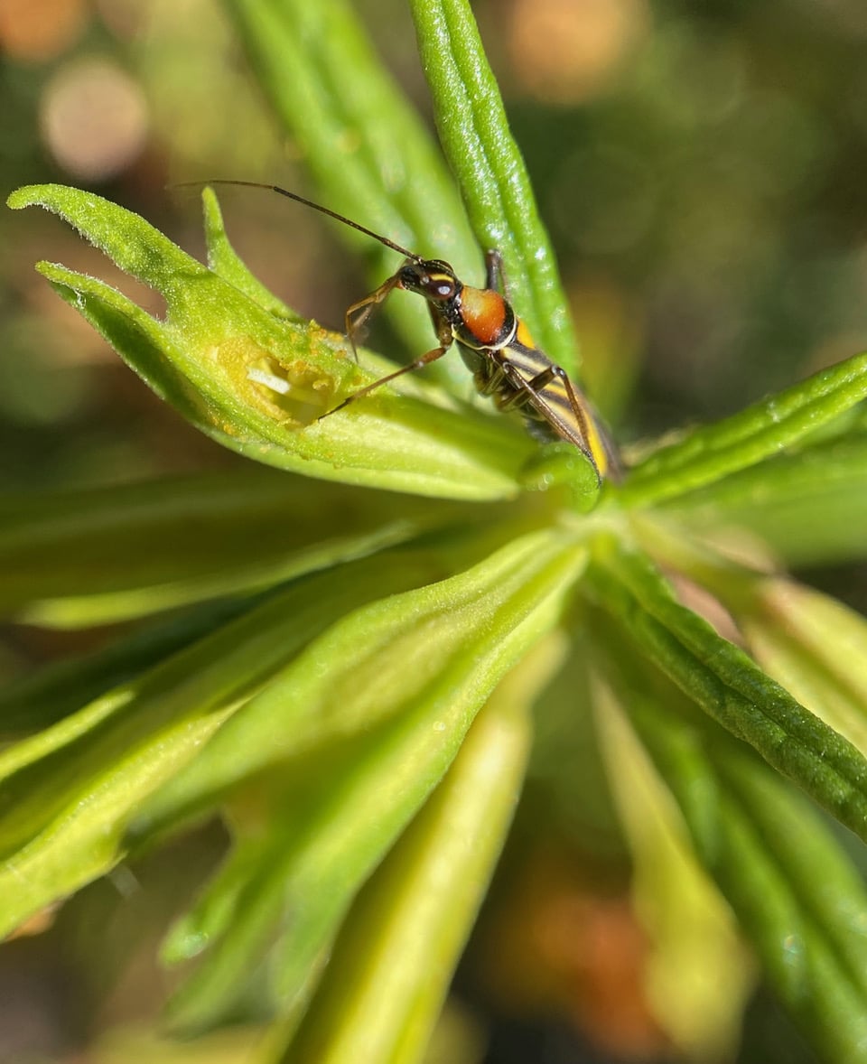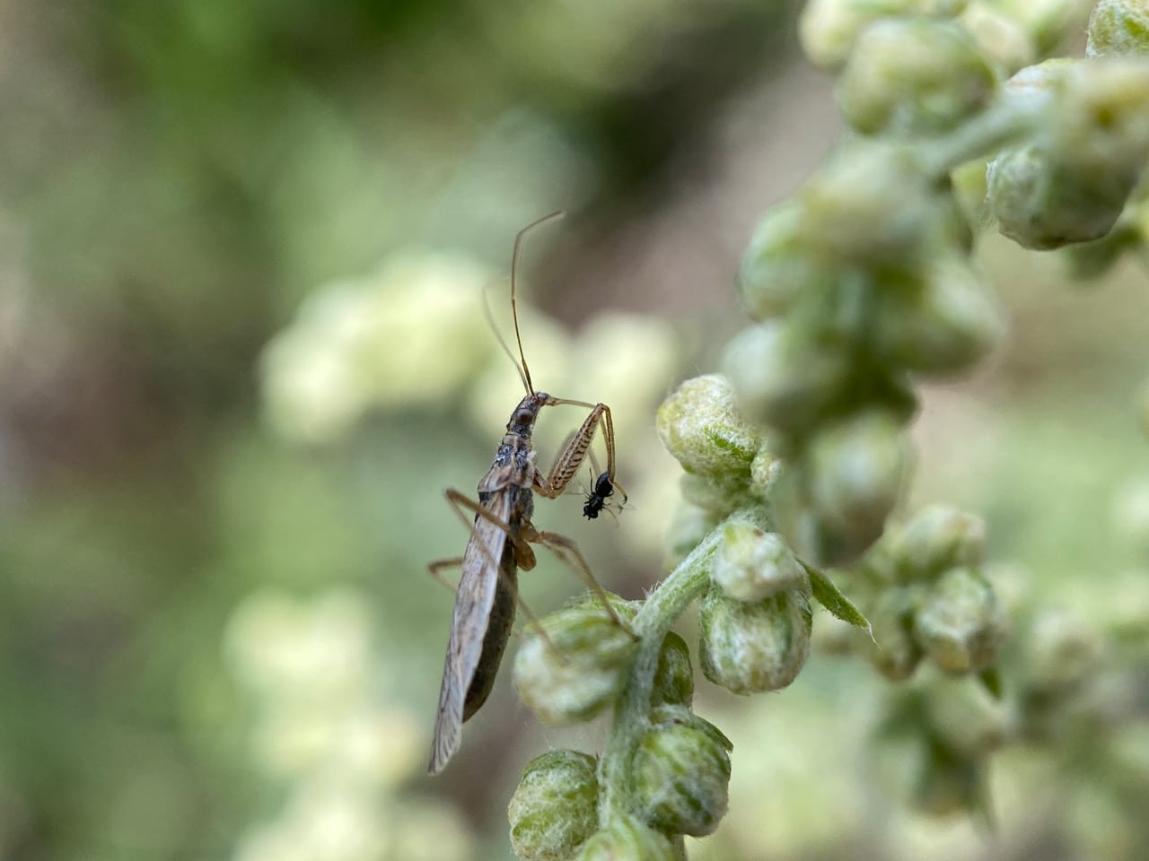 In the shadows of a California Mugwort, a Common Damsel Bug, Nabis americoferus (family Nabidae) is feeding on what appears to be a Chalcid Wasp that it has captured.