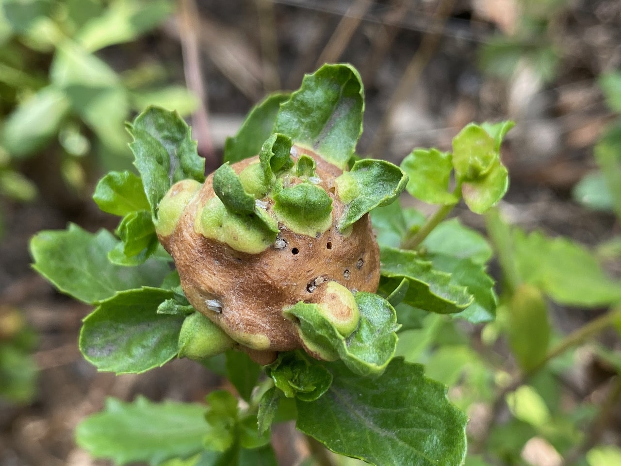 A large Coyote Brush Bud Gall has turned brown, and there are exit holes on the surface!