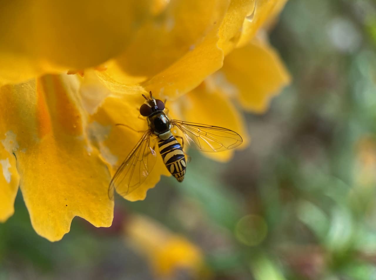 A female Oblique Streaktail, Allograpta obliqua (family Syrphidae) visits a Sticky Monkeyflower, Diplacus aurantiacus. Although small, it is one of the most easily recognizable hoverflies because of its distinct abdominal pattern.