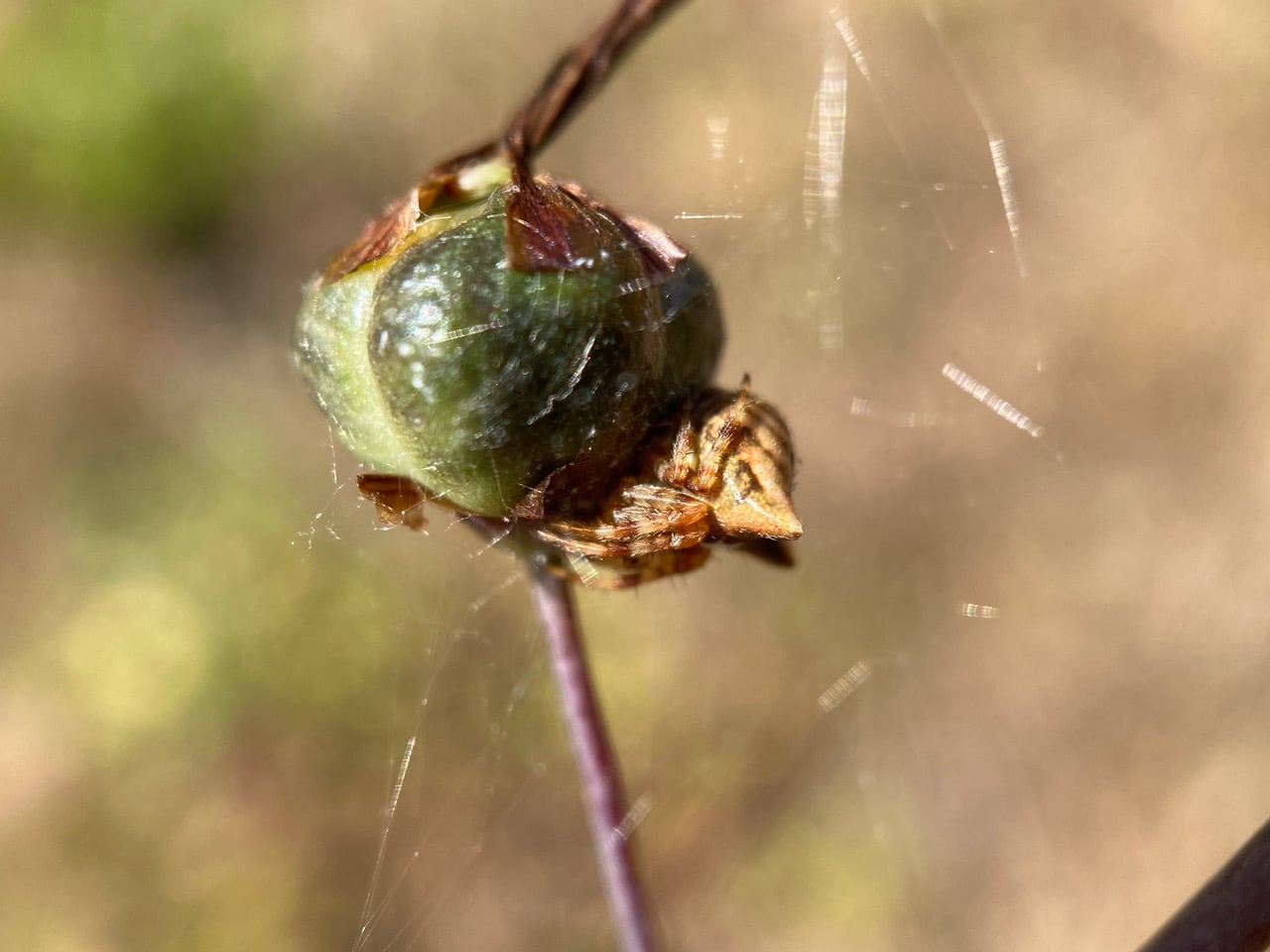 All its legs folded against the body, a Two-tubercled Orb-weaver, Gibbaranea bituberculata (family Araneidae) is resting under a young seed capsule of Soap Plant, Chlorogalum pomeridianum.