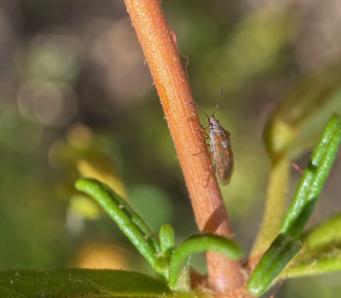 Mirid bugs are also referred to as plant bugs or leaf bugs. Miridae is one of the largest family of true bugs in the order Hemiptera. Like other Hemipterans, Mirids have piercing, sucking mouthparts to extract plant sap. Some species are predatory. The literature is mum on the dietary habits of Closterocoris. Both adults and nymphs are closely associated with the Sticky Monkeyflower.