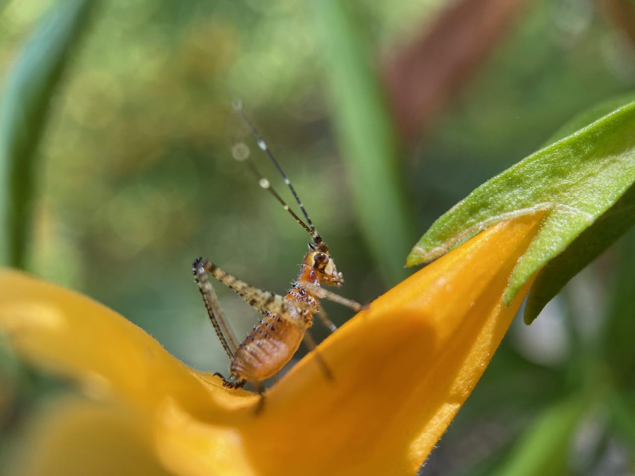 A nymph of Scudder’s Bush Katydid, Scudderia sp. (family Tettigoniidae) is perched on the back of a Sticky Monkeyflower, Diplacus aurantiacus.