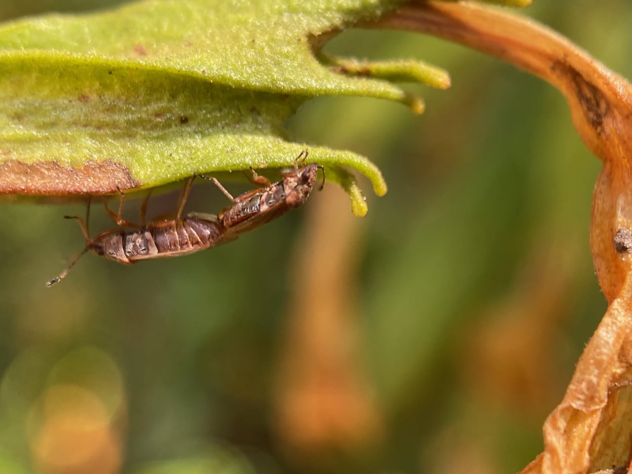 A Seed Bug, Kleidocerys franciscanus (family Lygaeidae) is cradled in the folds of the calyx of a Sticky Monkeyflower while a pair of the bugs are mating. These bugs are closely associated with Diplacus aurantiacus, apparently extracting nourishment from the young seeds within the calyces. Seed bugs are able to feed on seeds by injecting digestive juices into the seeds with their piercing-sucking mouthparts and sucking up the digested contents as a liquid. Both immature and adult bugs feed on plants this way.
