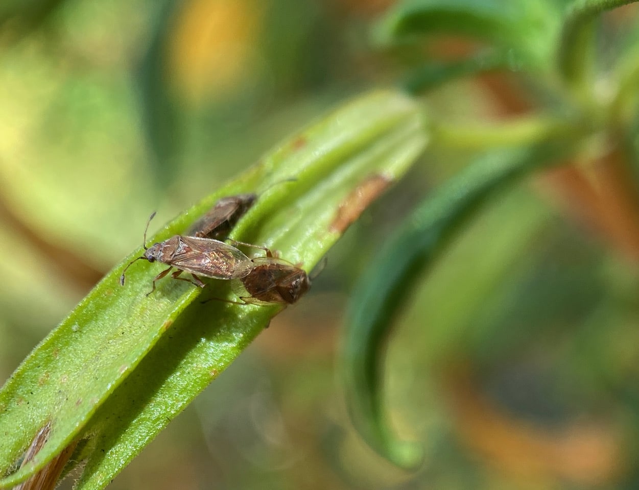 Another mating pair of the Seed Bugs, Kleidocerys franciscanus (family Lygaeidae) on the calyx of a wilted Sticky Monkeyflower in which seeds are maturing.