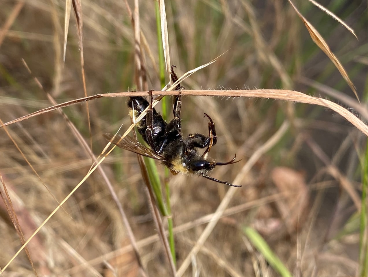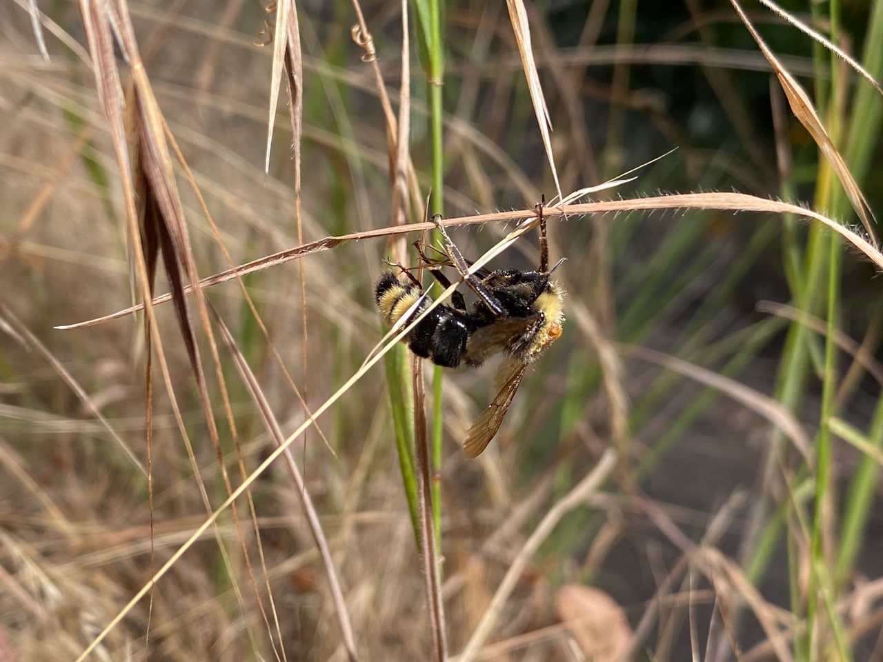 I stop to check some movements in the tall grasses along the trail. A bumble bee seems to be in trouble, struggling to get a perch on a grass stem. She is disheveled, somewhat emaciated, her wings are frayed on the edges, and there seems to be mites attached to her thorax. She has two distinct bands of yellow hairs on her abdomen – a California Bumble Bee? I can’t be sure until I see a black head.
