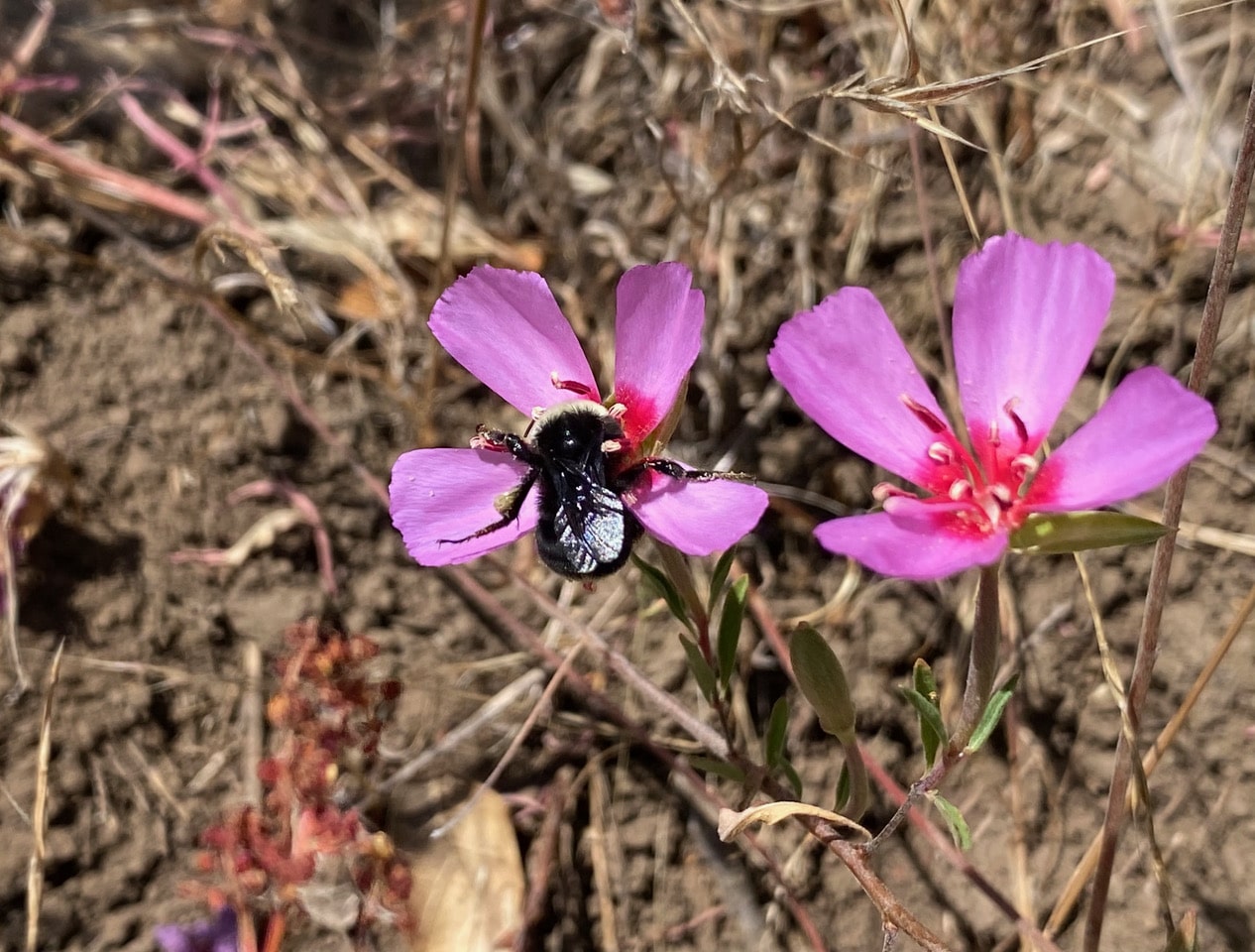 A Yellow-faced Bumble Bee, Bombus vosnesenskii is taking nectar from a Farewell-to-spring flower, Clarkia rubicunda. She has apparently been collecting pollen as well, as evidenced by the bit of purplish putty-like lump in the pollen basket on her hind leg. With floral resources dwindling, the summer blooming Clarkia is a real blessing for these late season bumble bees.
