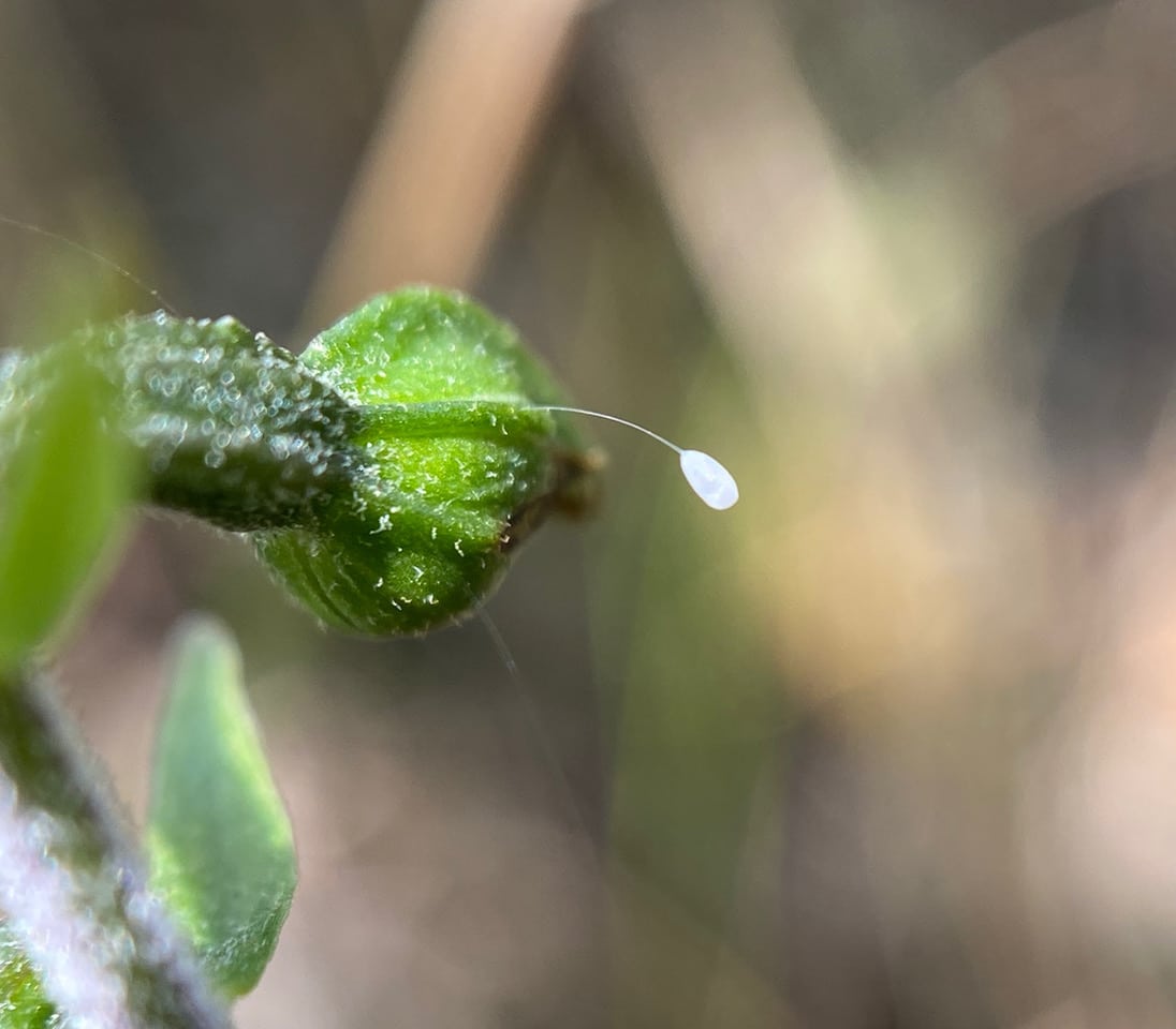 Ooh, a Lacewing egg attached to a developing fruit of Broadleaf Helleborine!