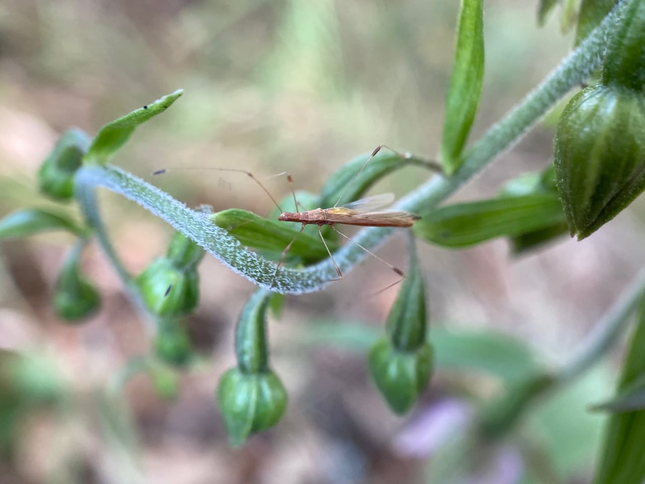 A slender, long-legged Stilt Bug (family Berytidae) is walking among the developing fruits of the Broadleaf Helleborine.