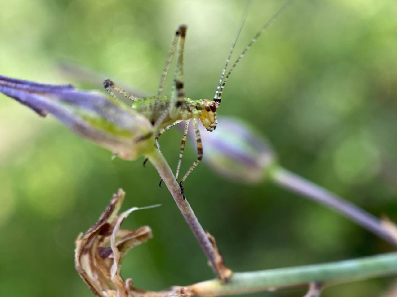 A nymph of a Scudder’s Bush Katydid, Scudderia sp. (family Tettigoniidae) is moving around among the Soap Plant flowers.
