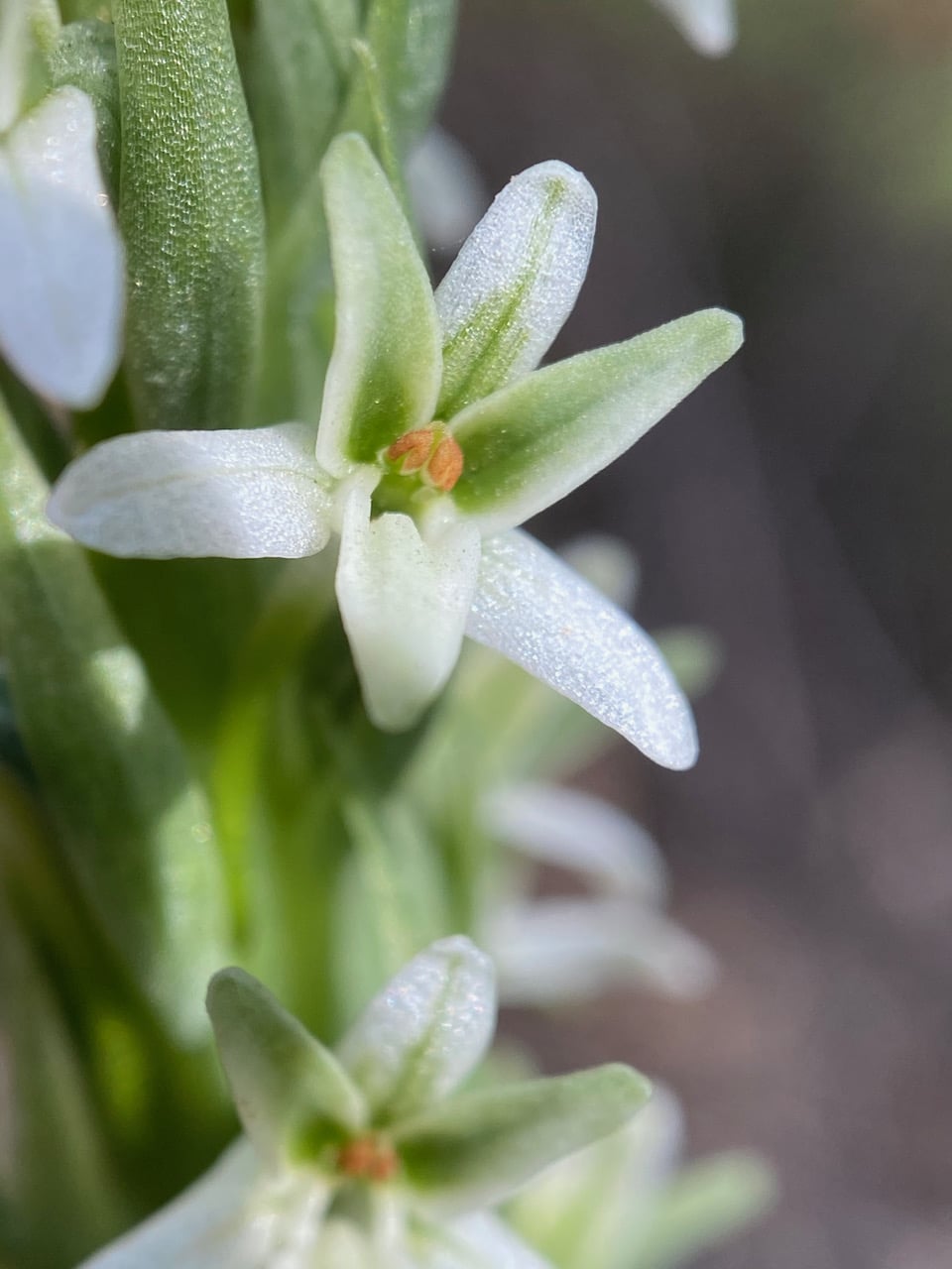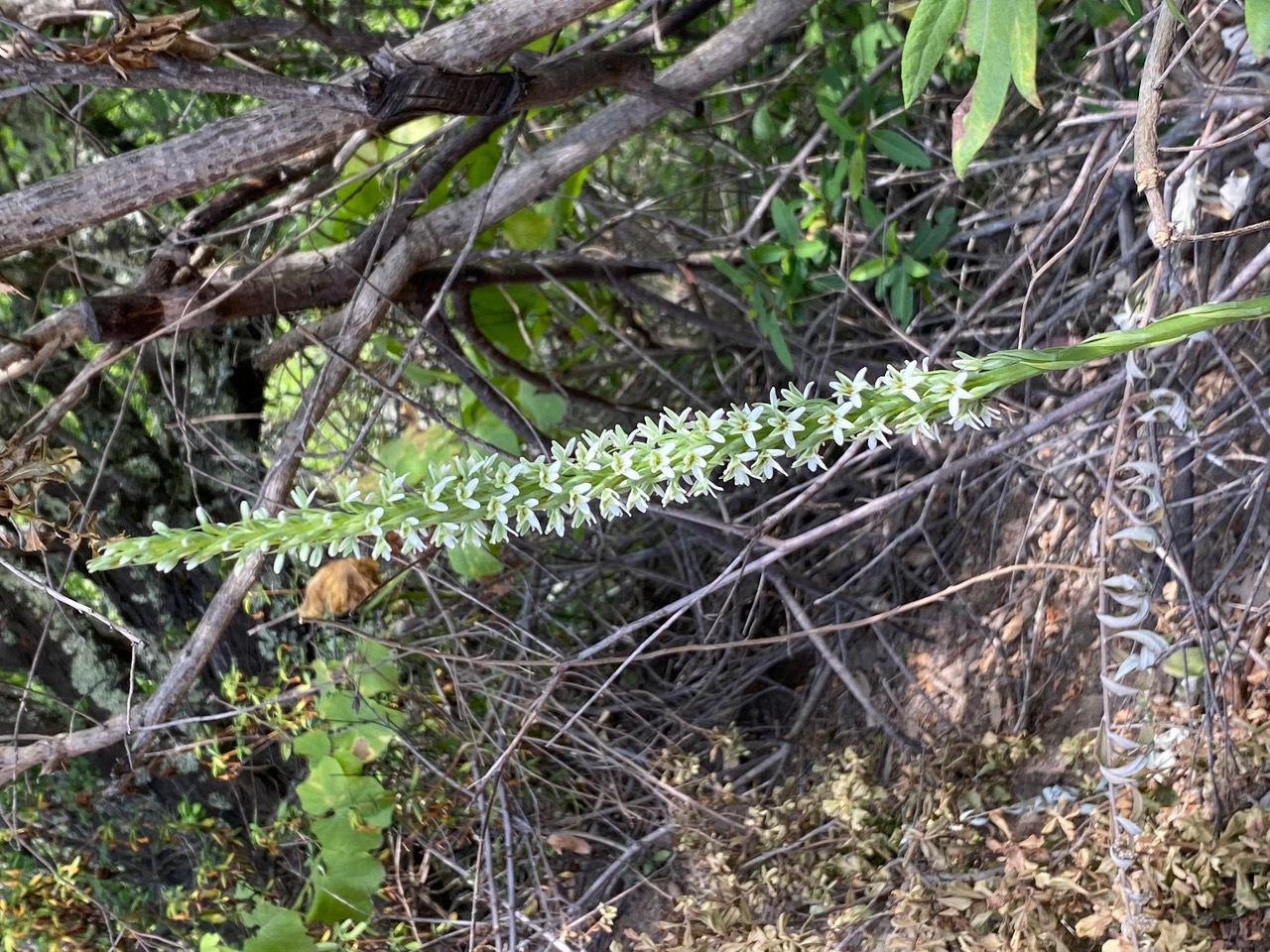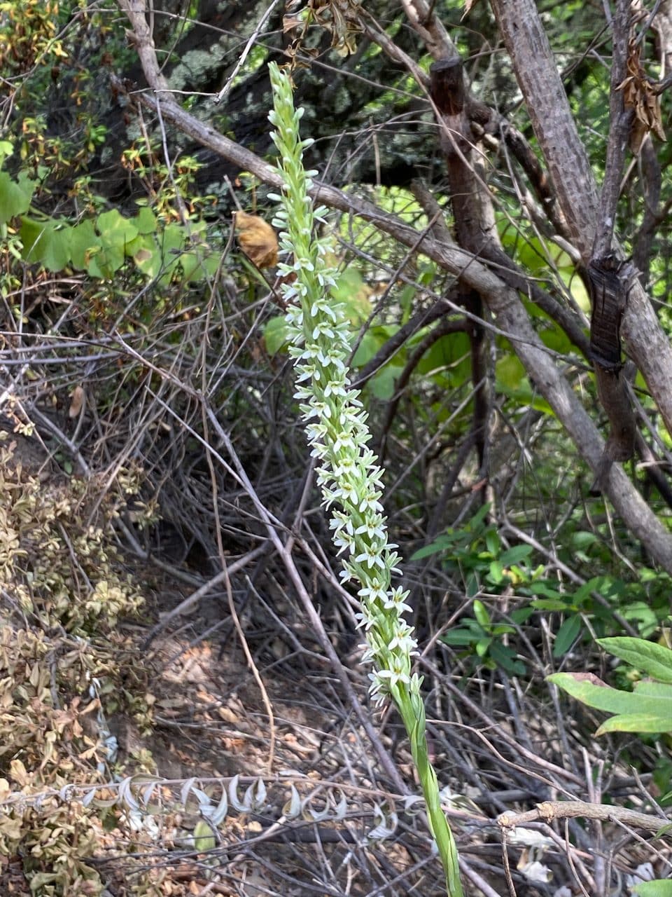 What a delight! A flower spike of Hillside Rein Orchid, Piperia elegans shows up on the brushy side of the trail. The tiny green-white flowers emit a fragrance at night to attract pollinating moths.