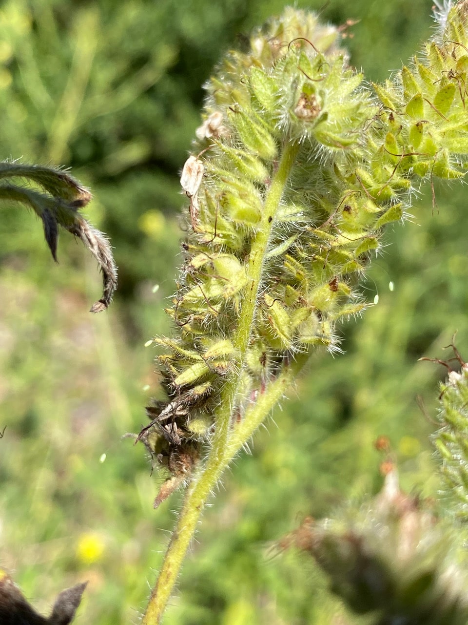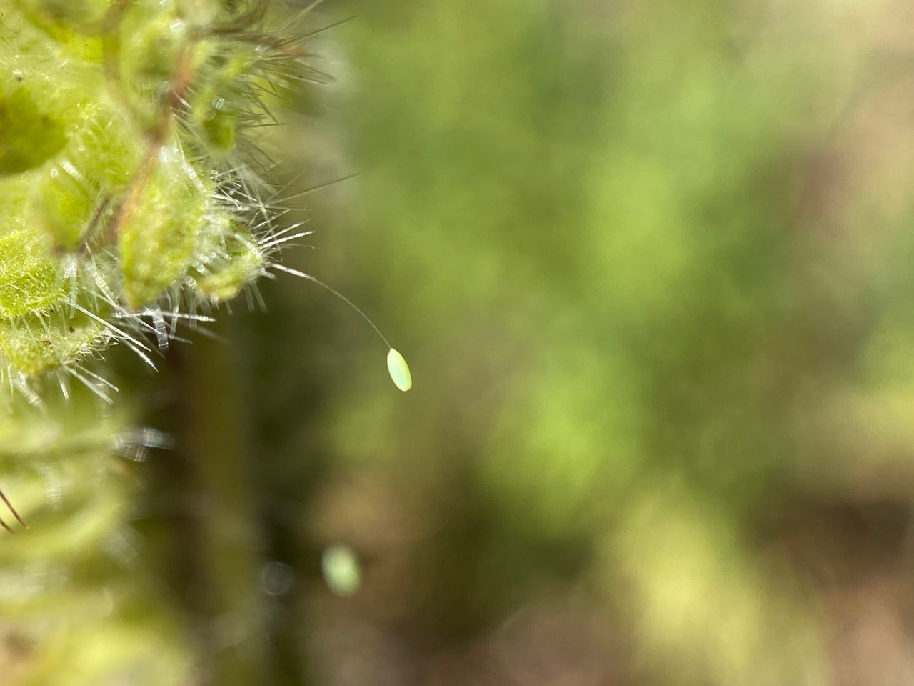 Hey, a fresh Lacewing egg that is still green! It is attached by a silken stalk to the bristly bracts of a spent inflorescence of California Phacelia, Phacelia californica.