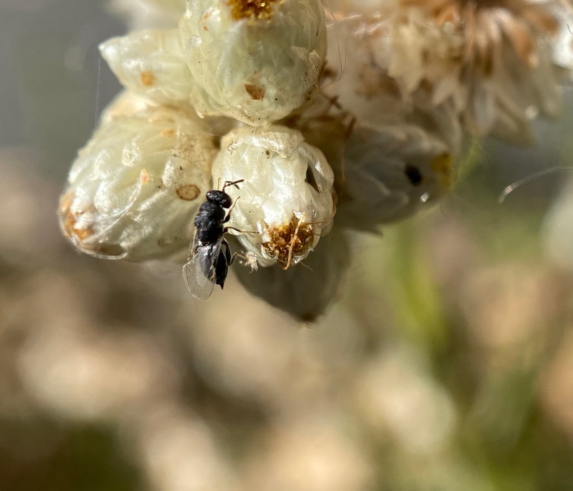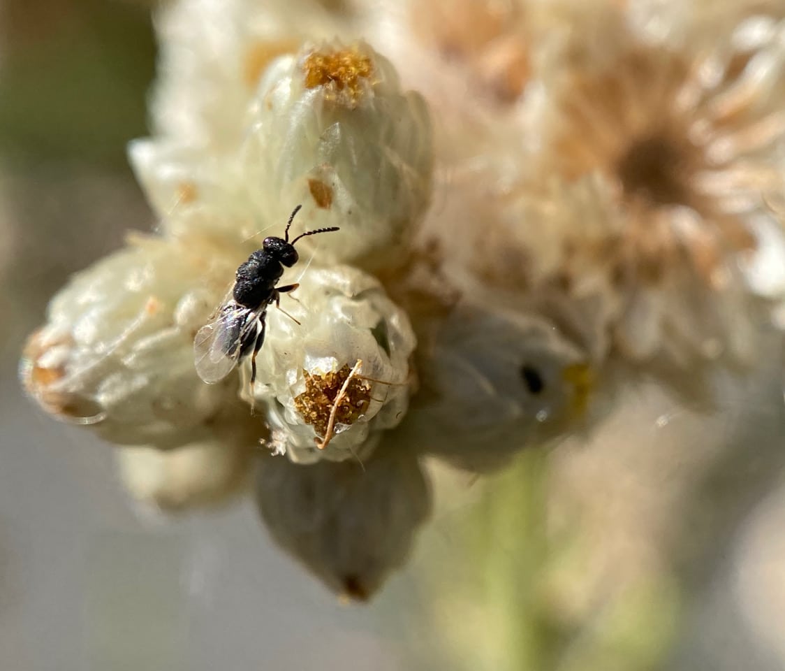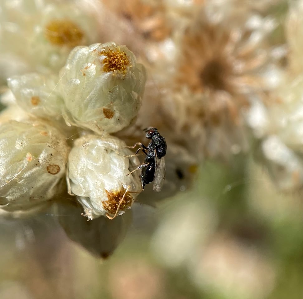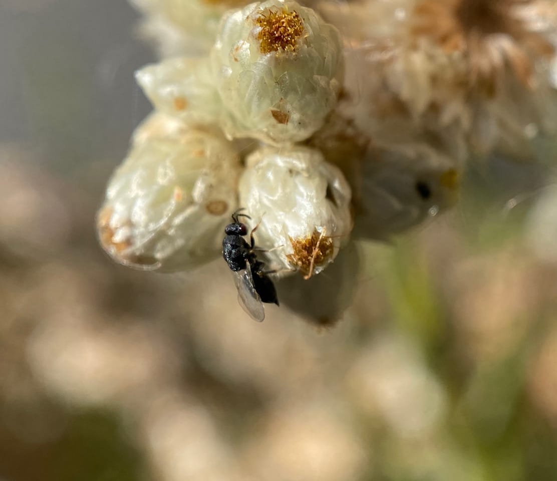 Ooh, here’s a tiny parasitoid wasp investigating a flowerhead of California Everlasting! It is tapping the phyllaries with its antennae – looking for a place to lay eggs?
