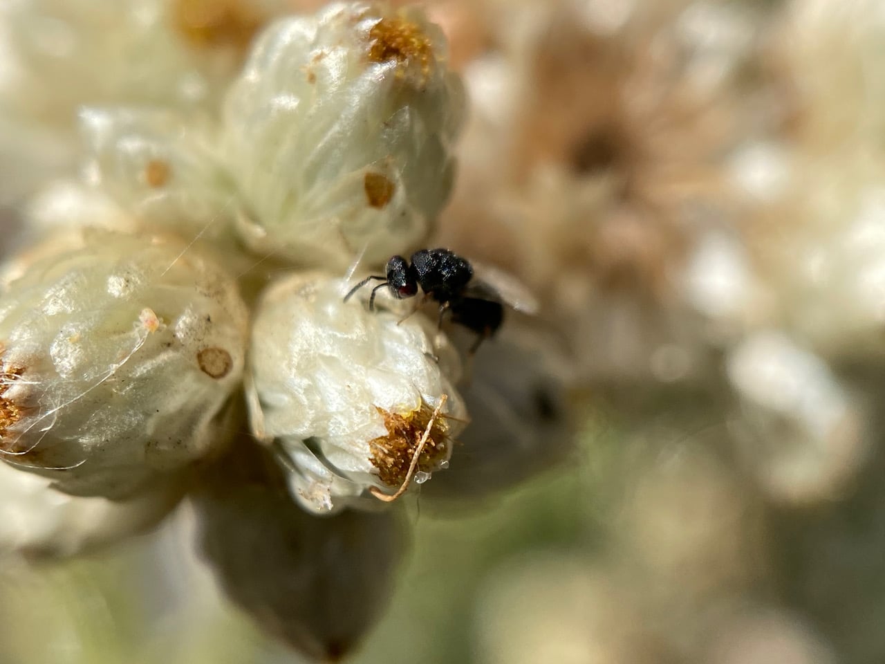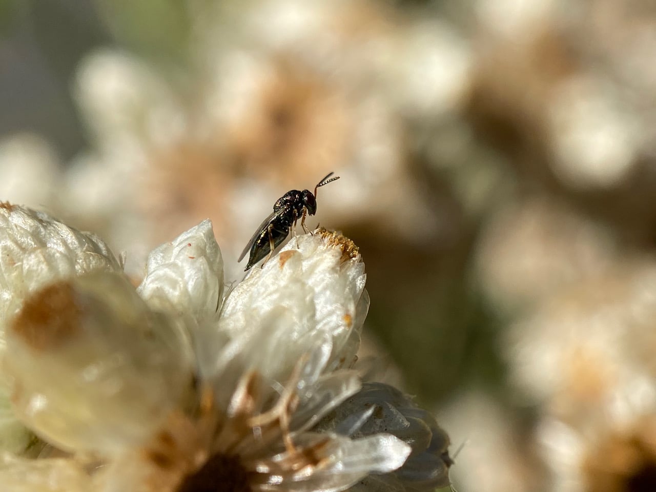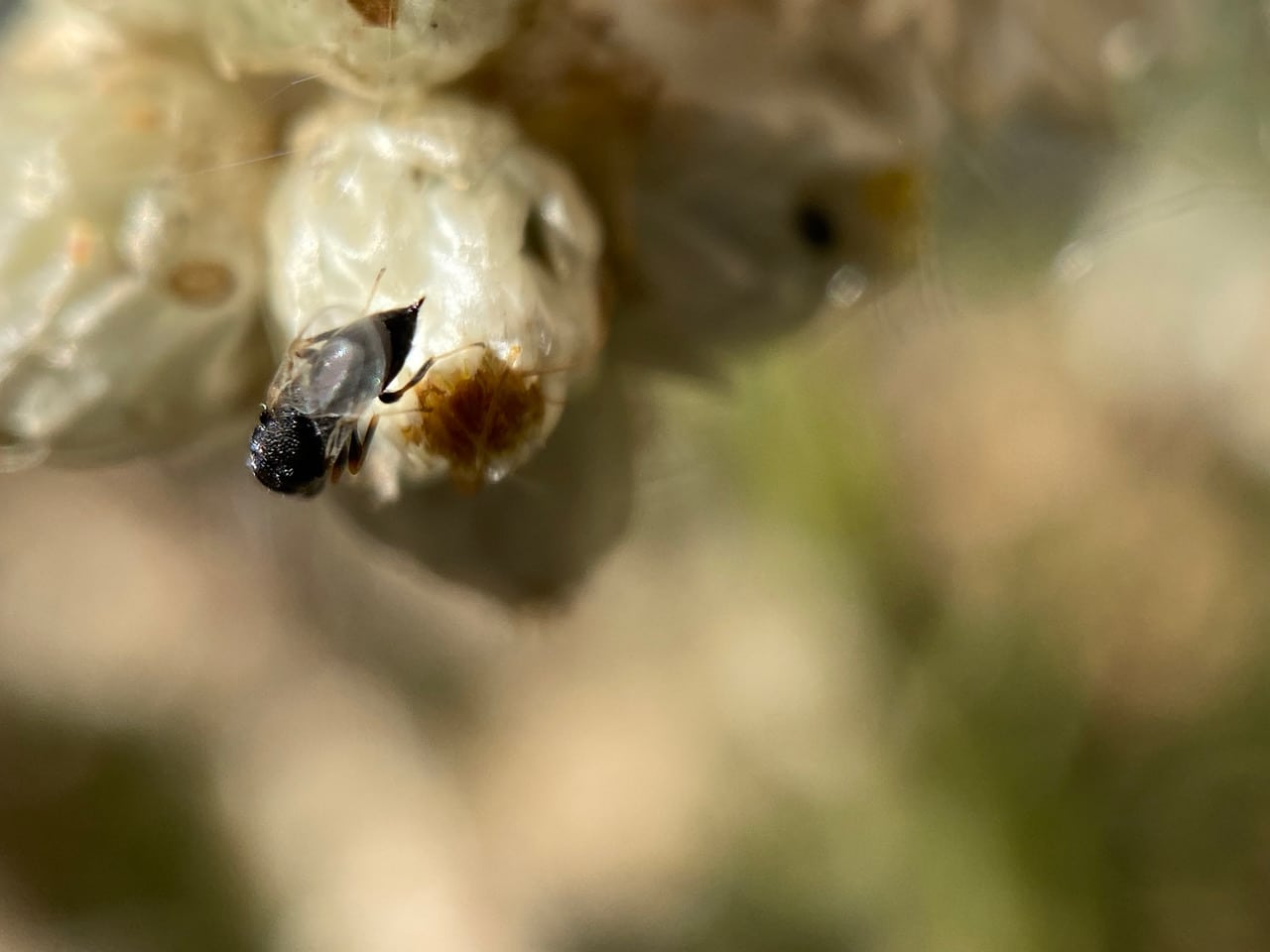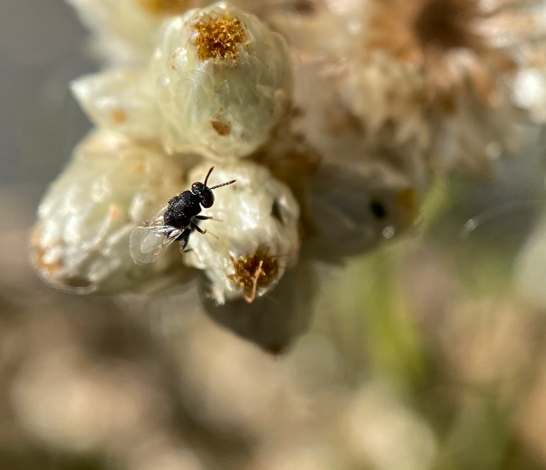 Ooh, here’s a tiny parasitoid wasp investigating a flowerhead of California Everlasting! It is tapping the phyllaries with its antennae – looking for a place to lay eggs?