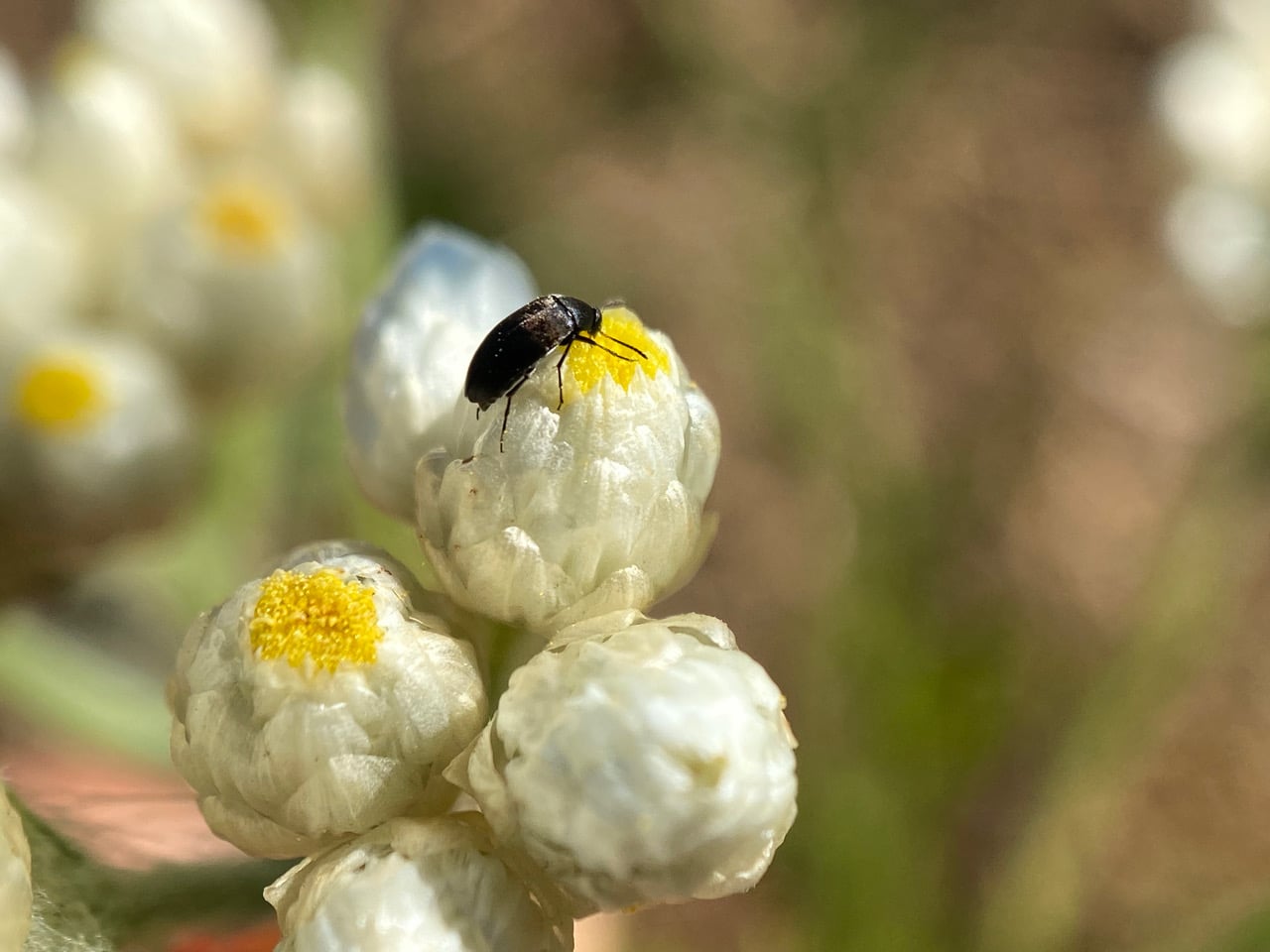 A False Flower Beetle, Anaspis atrata (family Scraptiidae) is feeding on the exposed flowers of California Everlasting, Pseudognaphalium californicum.