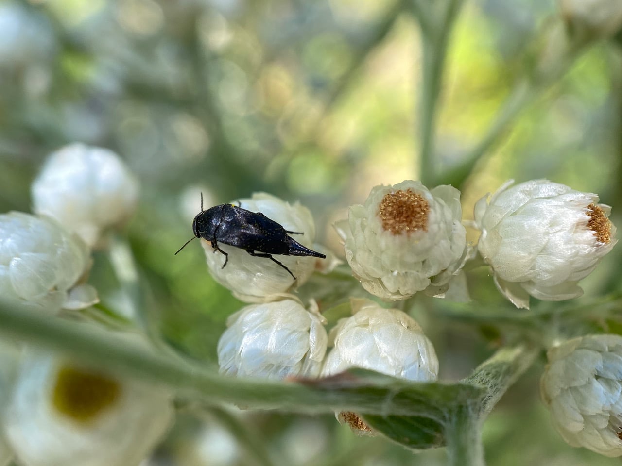 A Tumbling Flower Beetle (family Mordelidae) is feeding on the flowers of California Everlasting, Pseudognaphalium californicum.