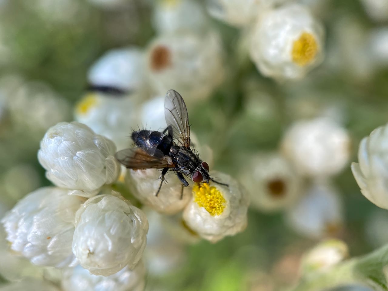 A Woodlouse Fly, Stevenia deceptoria (family Rhinophoridae) is feeding on a freshly opened flowerhead of Calfornia Everlasting.