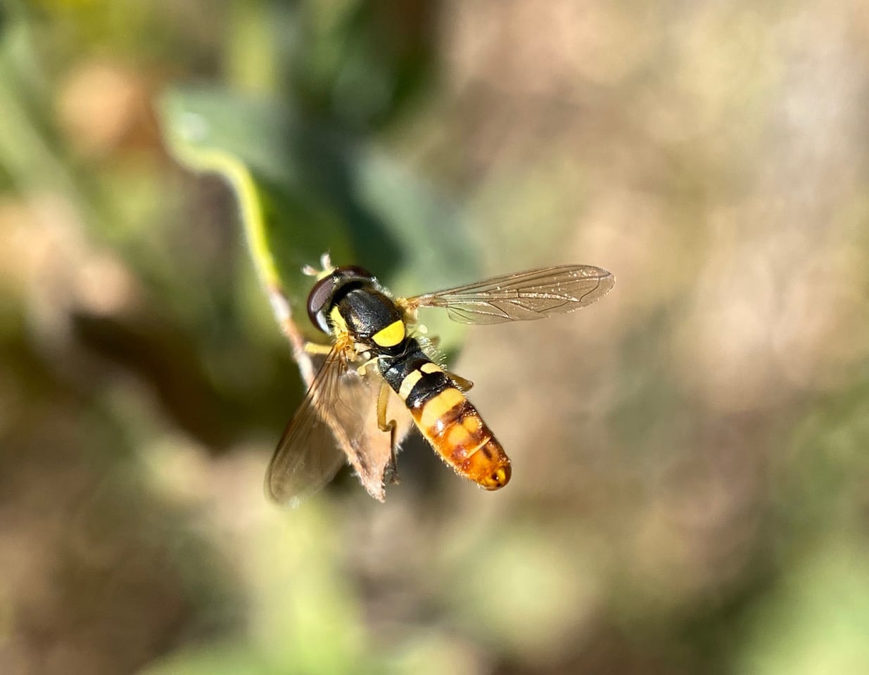 A male Forked Globetail, Sphaerophoria sulphuripes (family Syrphidae) lands on a leaf of Coast Tarweed. This species of hover fly exhibits marked sexual dimorphism – the males and females are morphologically distinct.
