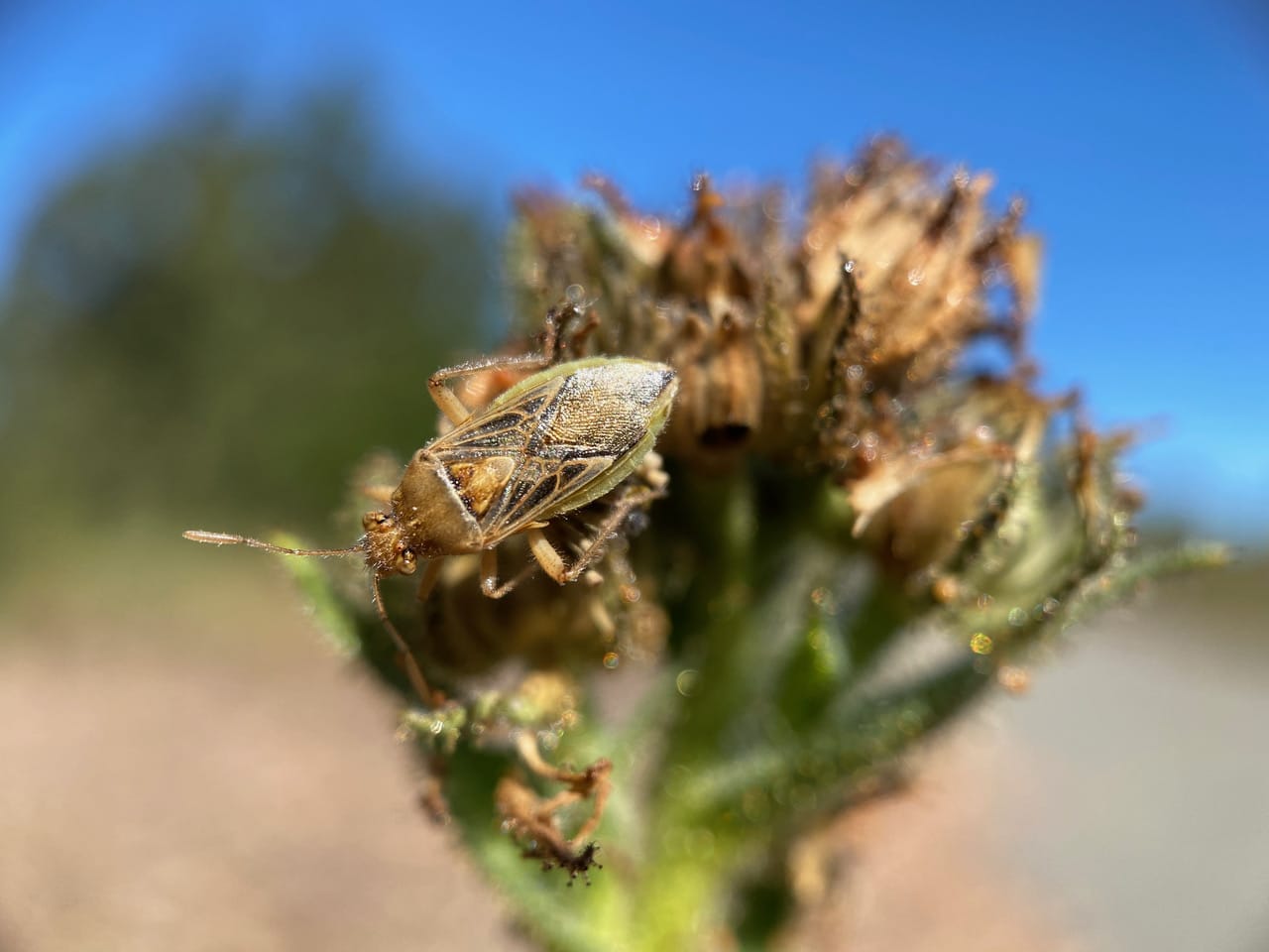 Although a fairly large insect, the Scentless Plant Bug, Arhyssus sp. (family Rhopalidae) is not easily seen on the seed heads of the Coast Tarweed against which it is perfectly camouflaged.