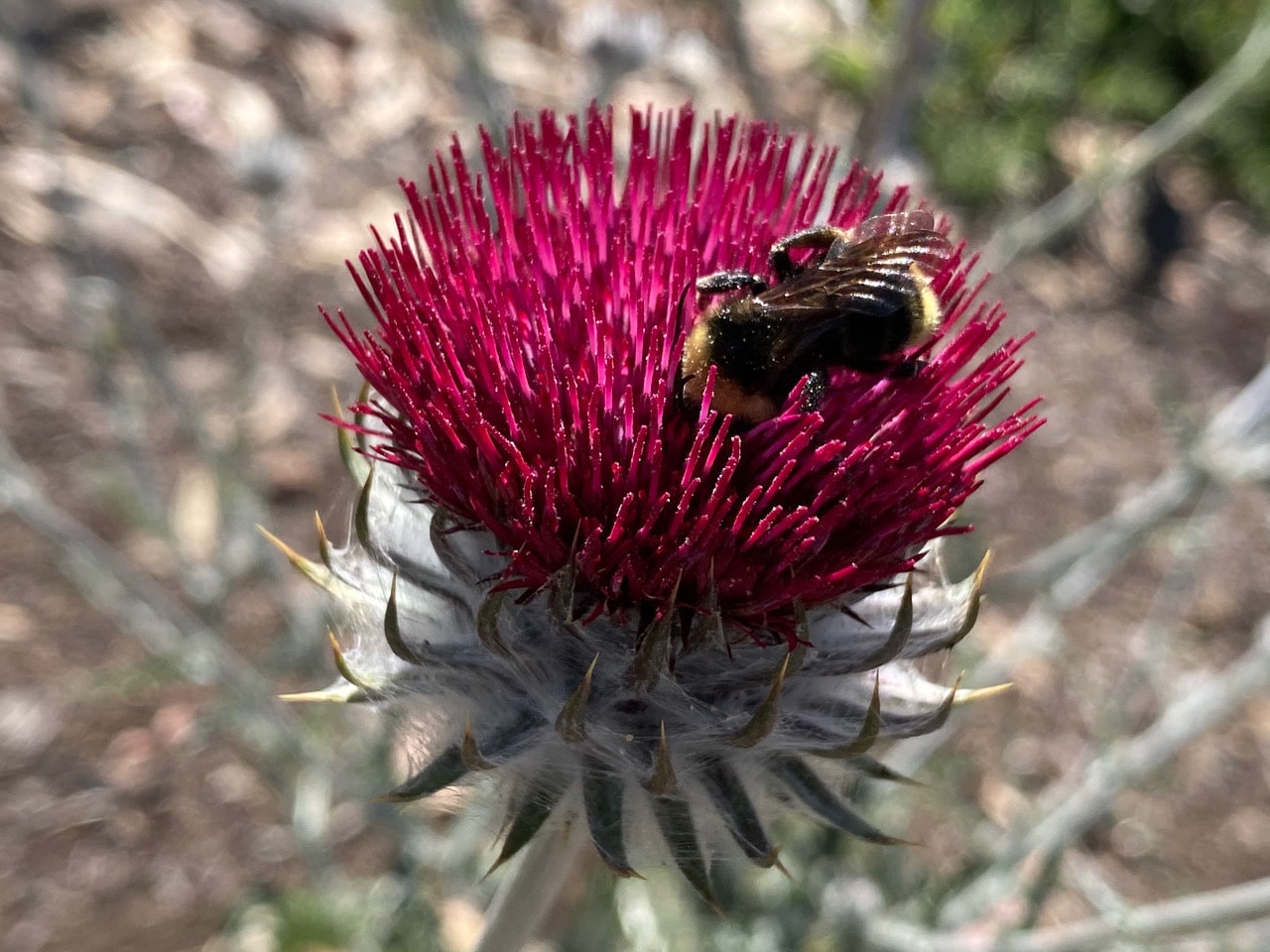 Fortunately, the younger thistles are still in bloom, providing an extended source of nectar and pollen to the insects. Again, I am kept waiting for the bumble bees to lift their heads from the flowerhead to determine their identity – whether Yellow-face Bumble Bee, Bombus vosnesenskii, or California Bumble Bee, B. californica. Both species visit the thistles extensively for nectar.