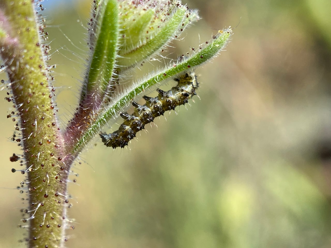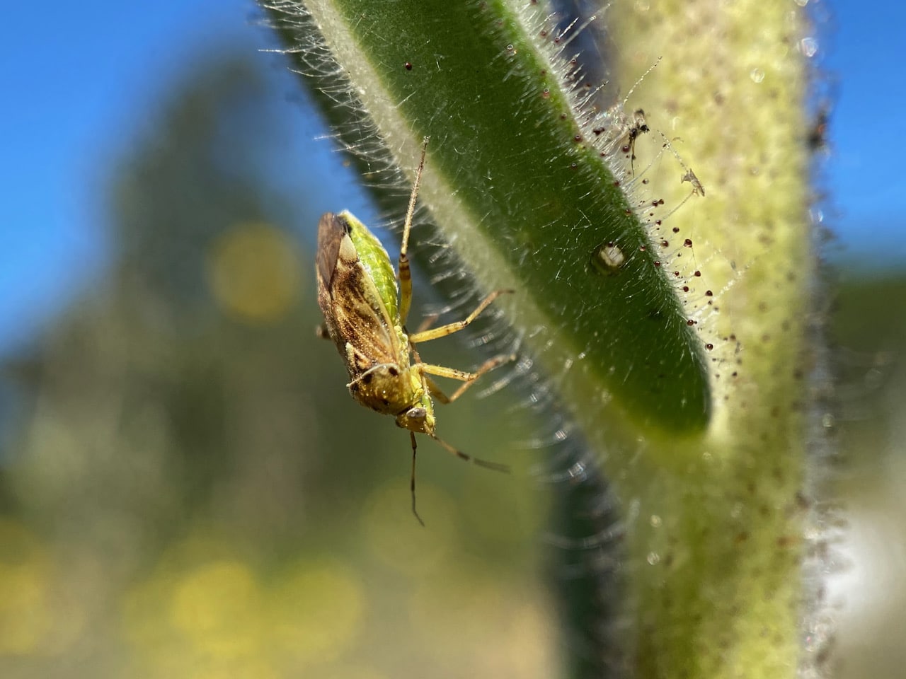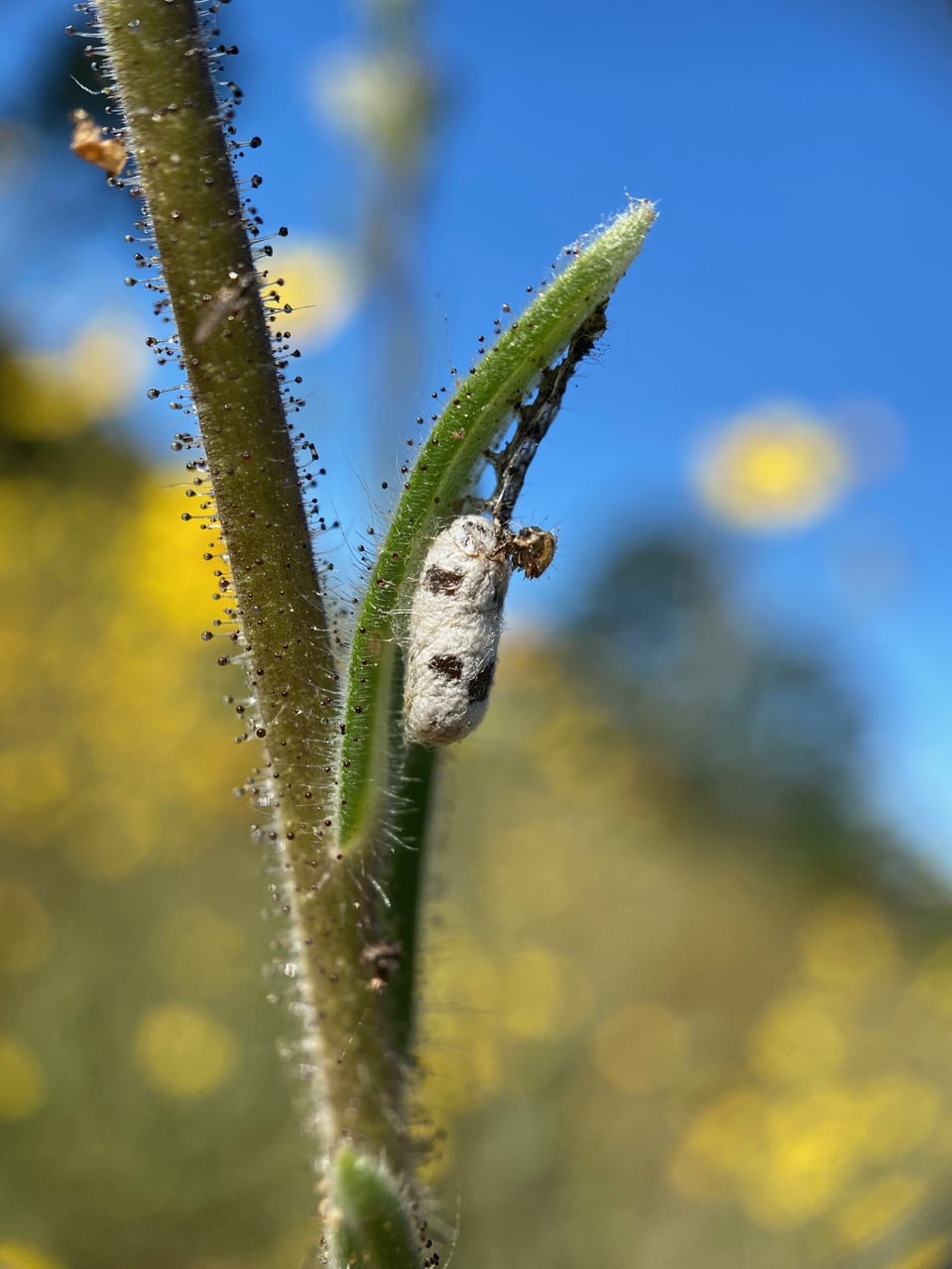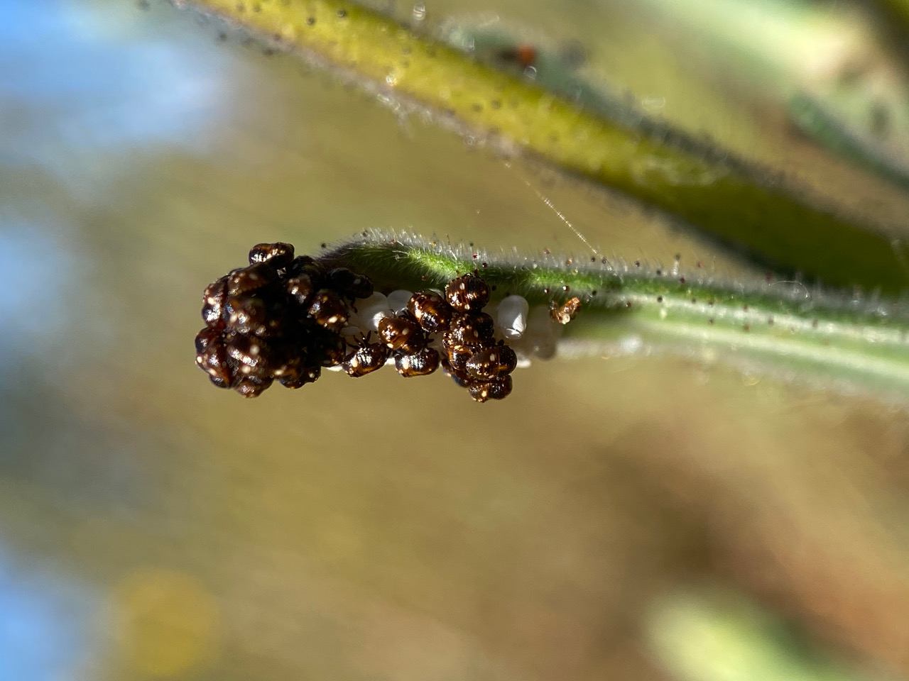 On another plant, among the glandular hairs of the stem, another cluster of bug eggs has been deposited. Some of the eggs have either hatched or been predated.