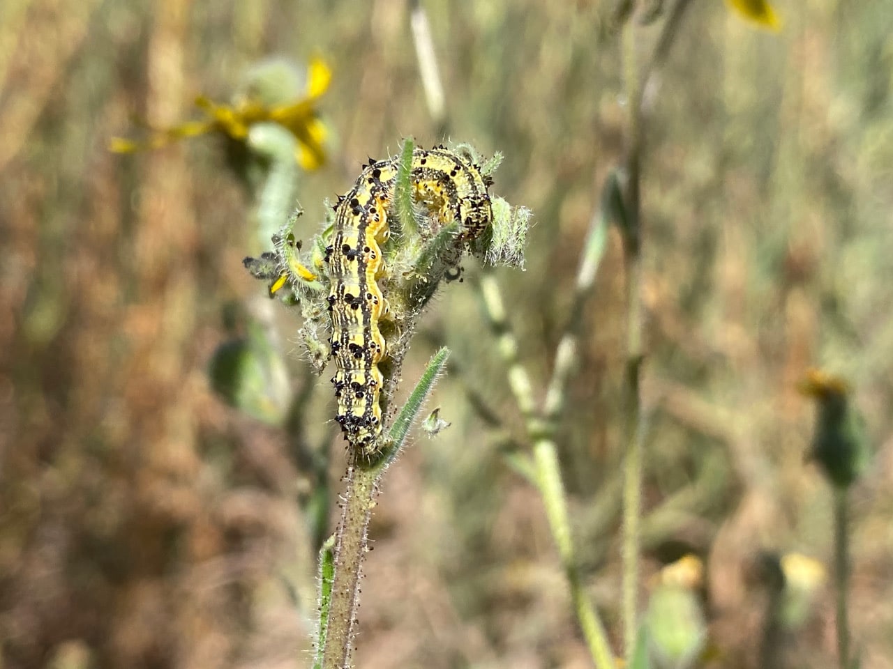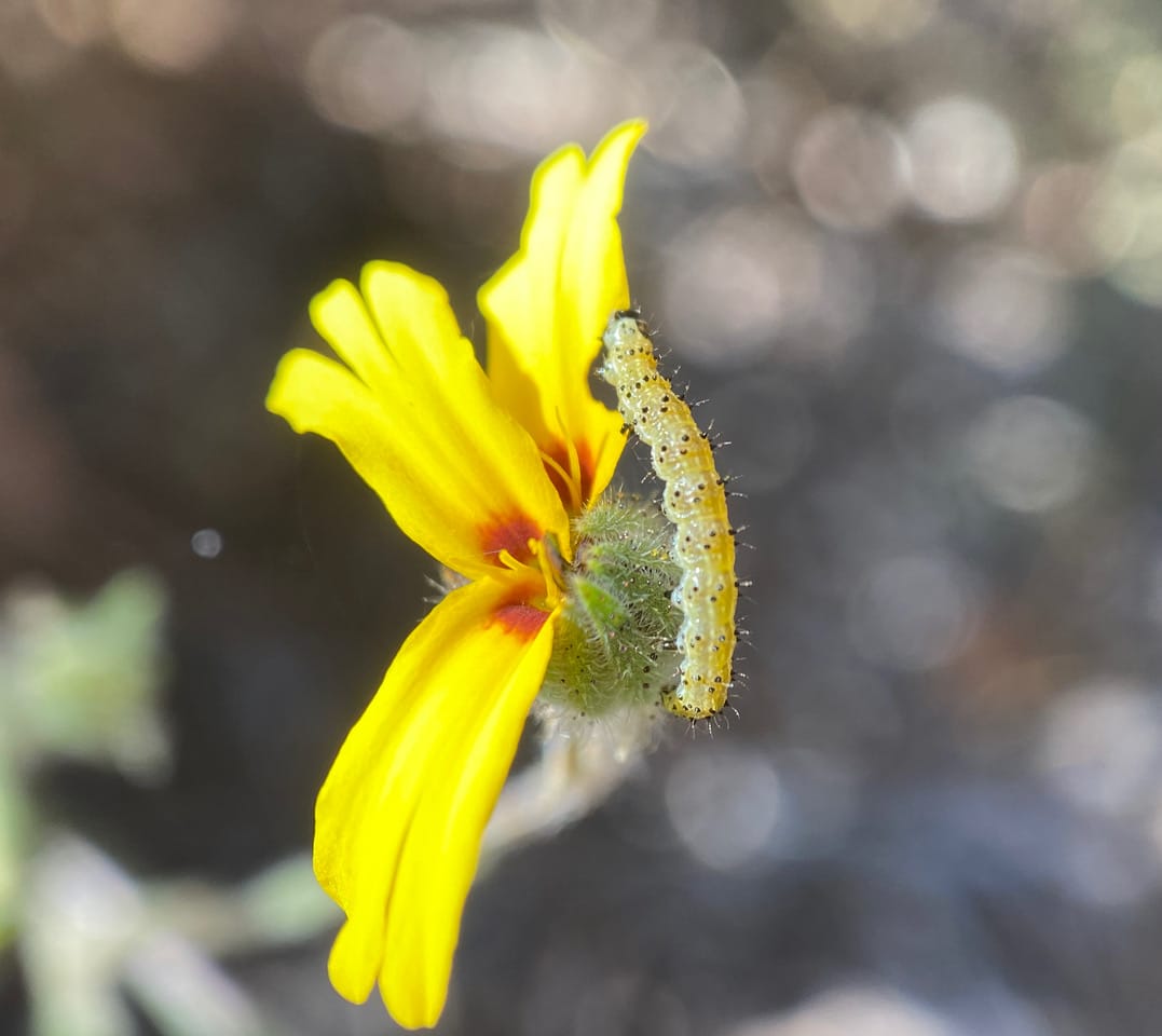 Everywhere I look in the Siesta Gate tarweed patch, there are caterpillars of all ages and sizes…. This is definitely a major infestation! Something is out of balance here.