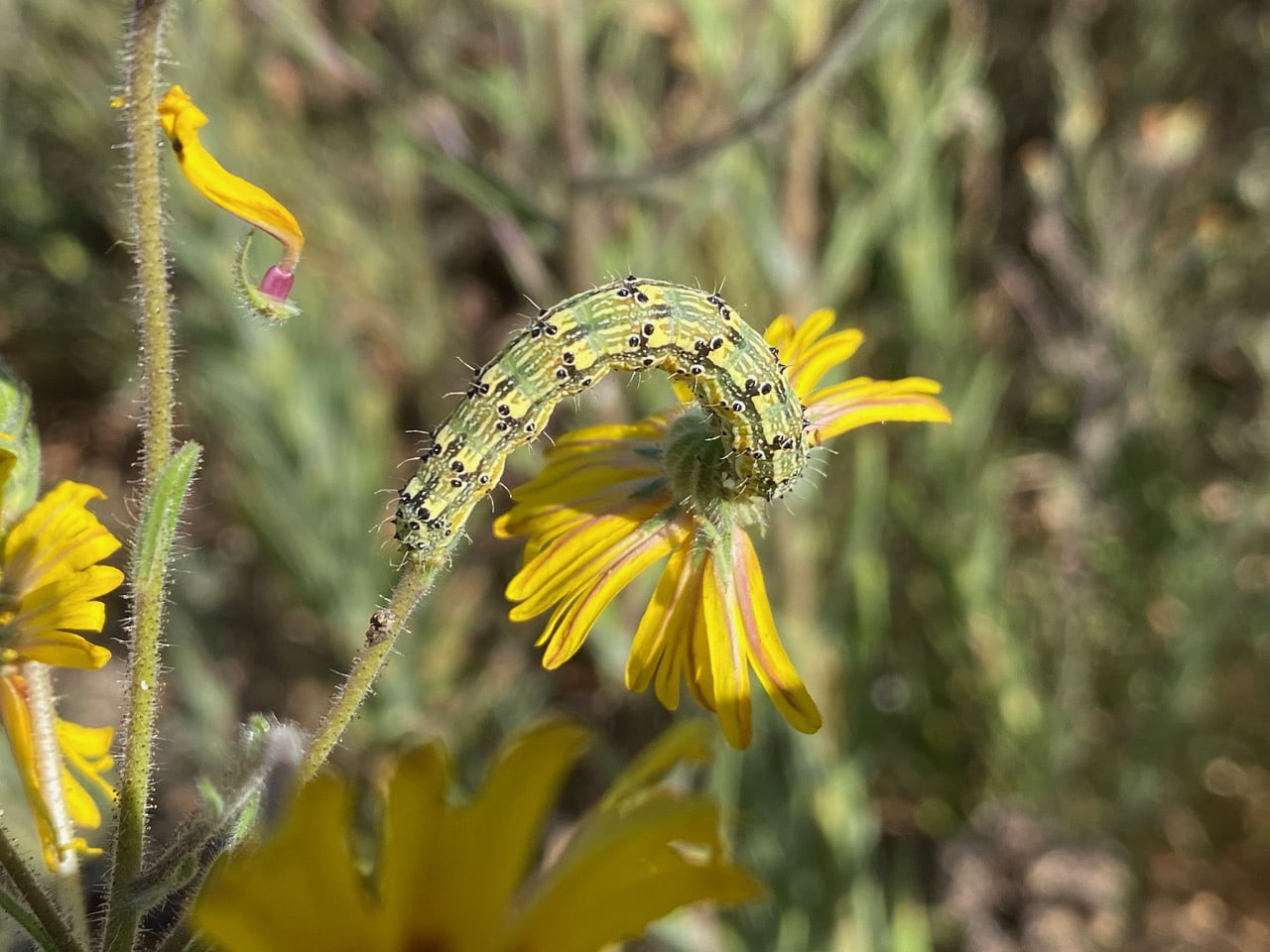 An older caterpillar is feeding on an unopened flowerhead. Heliothodes diminutiva is an Asteraceae specialist; eggs are laid on or near immature flowerheads, larvae feed on the reproductive parts of the flowers.