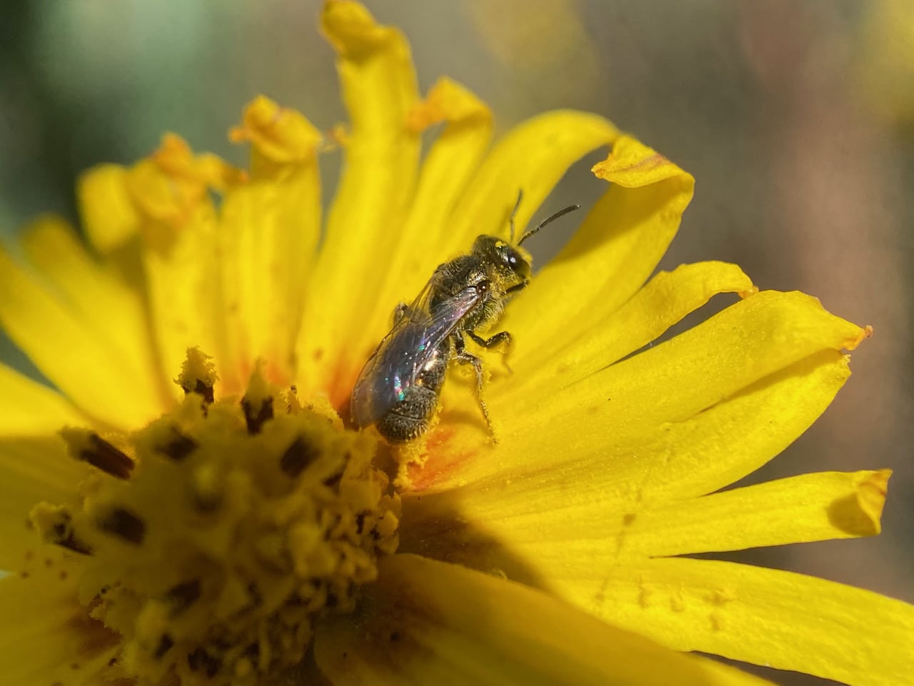 The bee has also gathered pollen on the underside of her abdomen. Sweat Bees (family Halictidae) carry pollen on their entire hind leg and abdomen.