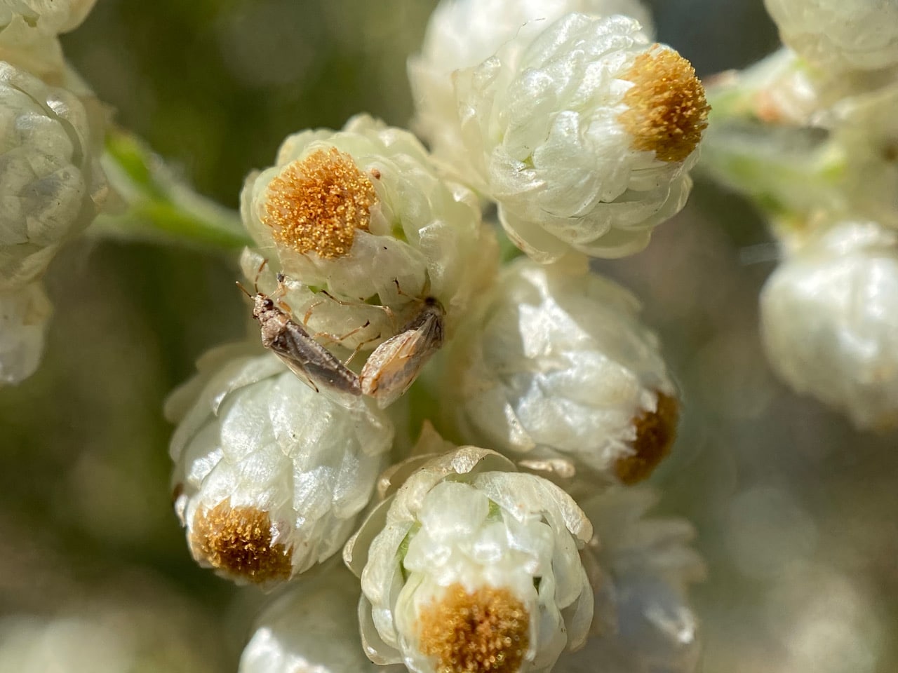 A Tumbling Flower Beetle (family Mordellidae) is roaming the flowerheads of a California Everlasting, Pseudognaphalium californicum.