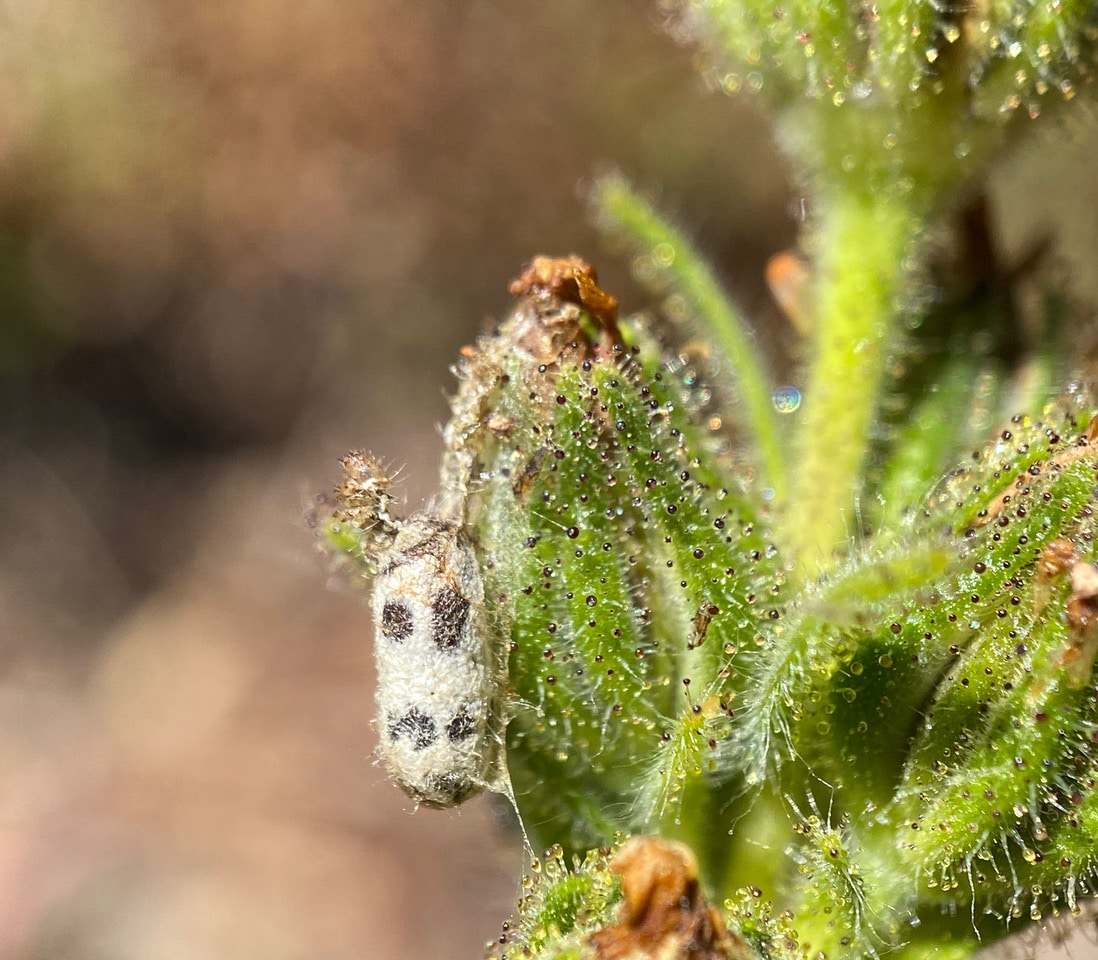 A Lacewing egg (family Chrysopidae) is suspended on a fine silk stalk attached to the California Everlasting. The larva might have already hatched from the egg.