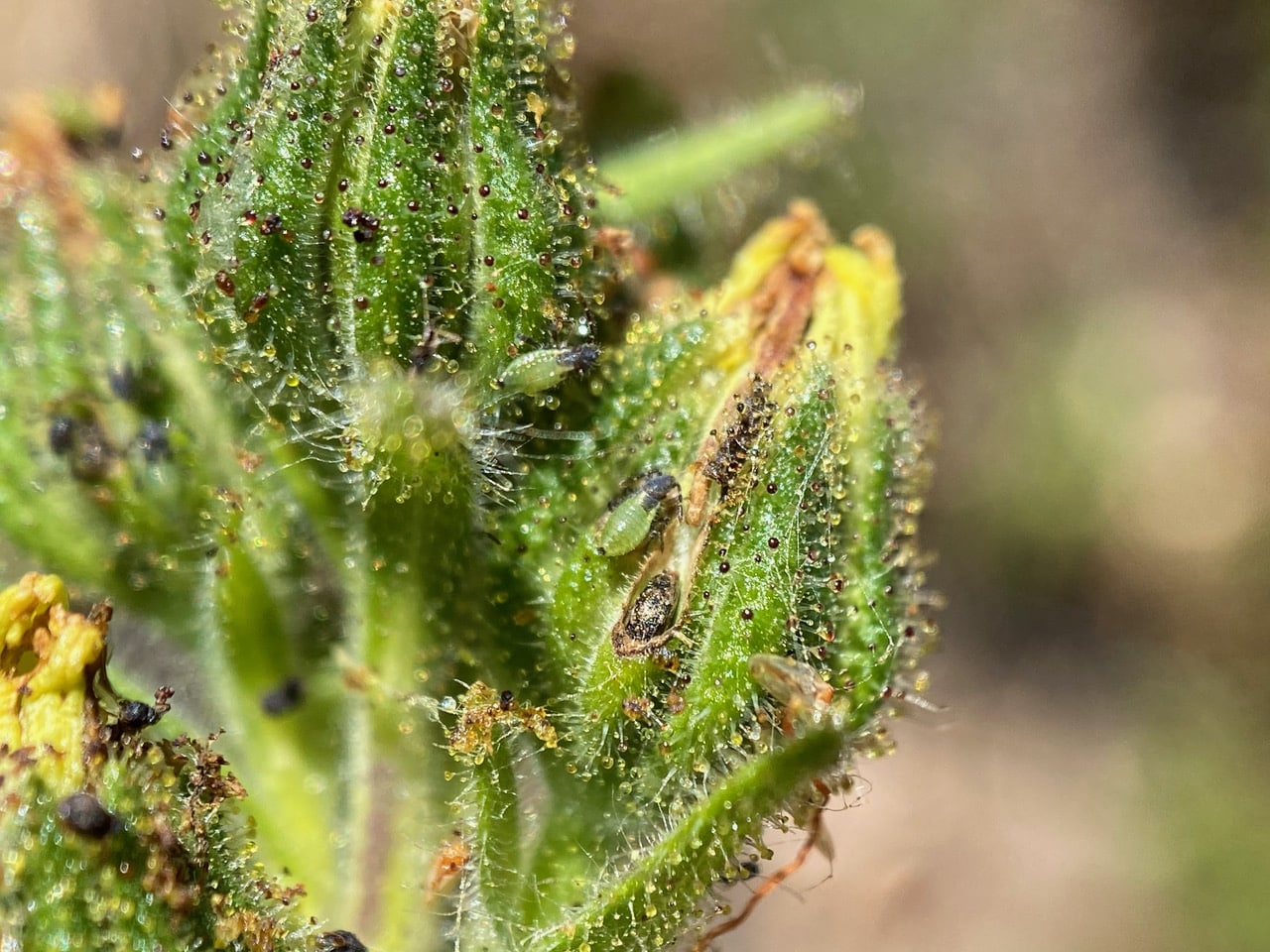 It is much easier to observe insects on the Coast Tarweed along the paved road, in contrast to the impossibly dense stand at Siesta Gate. I don’t have to risk getting the sticky exudates on me, my camera and lens. It is by far the hardest plant to photograph at close range! I can’t even touch the plant to steady it from the wind to take a picture. The tar sticks to my fingers and everything else I touch afterward.