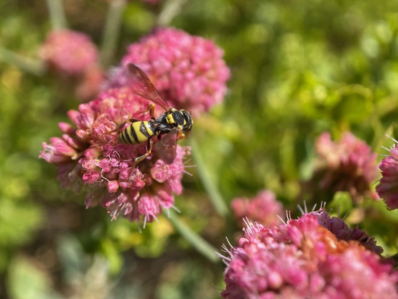 That looks like a mason wasp, but I know by now that it is actually a Cuckoo Bee, Complex Nomada vegana. I have learned to rely on the black-and-yellow pattern on the abdomen as well as the eyes for distinguishing the two. Both the cuckoo bee and the mason wasp frequent this patch of buckwheat, making the learning process fun and rapid.