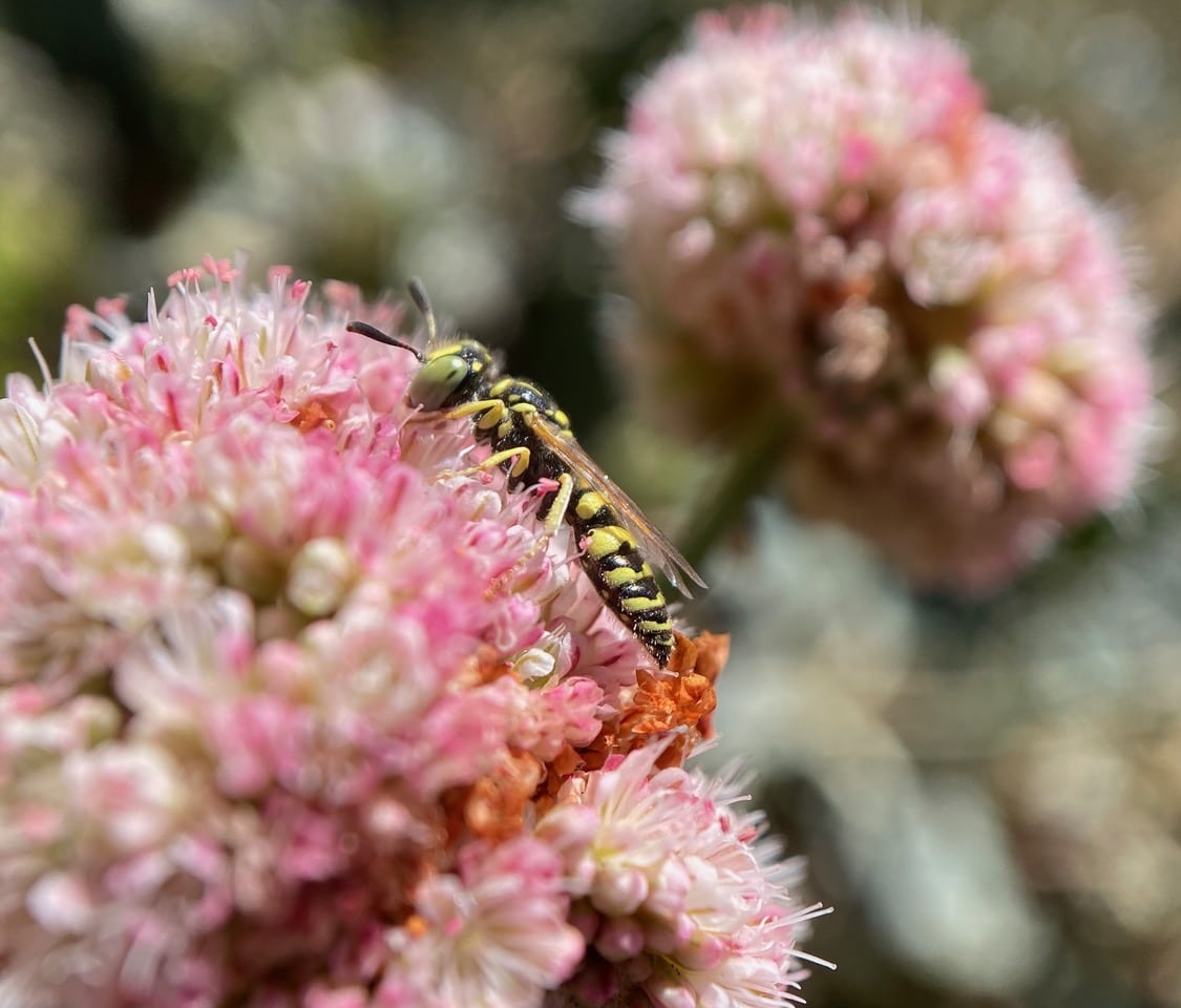 Here’s another dune dweller that frequents the flowers in the native garden. An American Sand Wasps, Bembix americana (family Crabronidae) is taking nectar from an inflorescence of Red-flowered Buckwheat, Eriogonum grande ssp. rubescens.