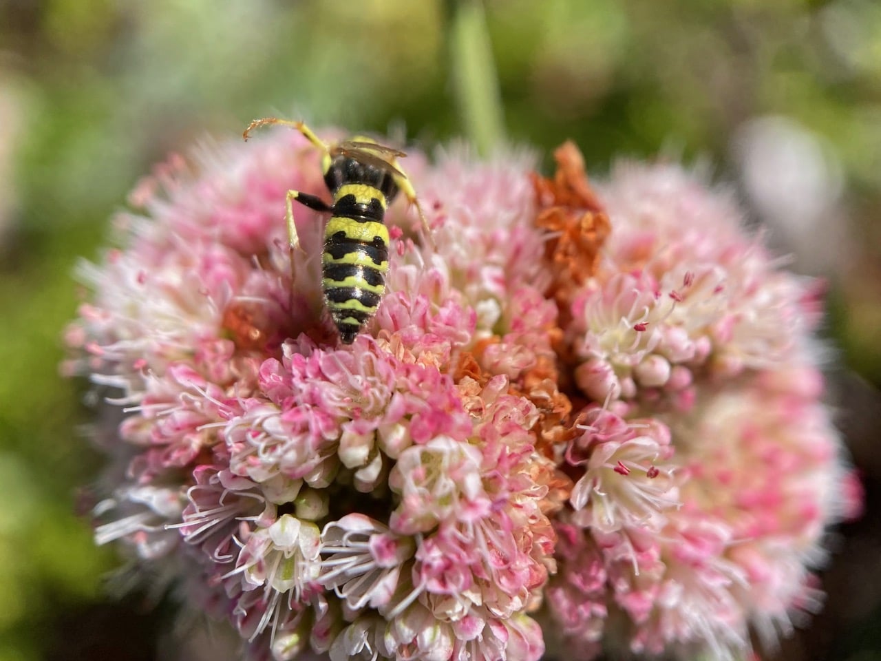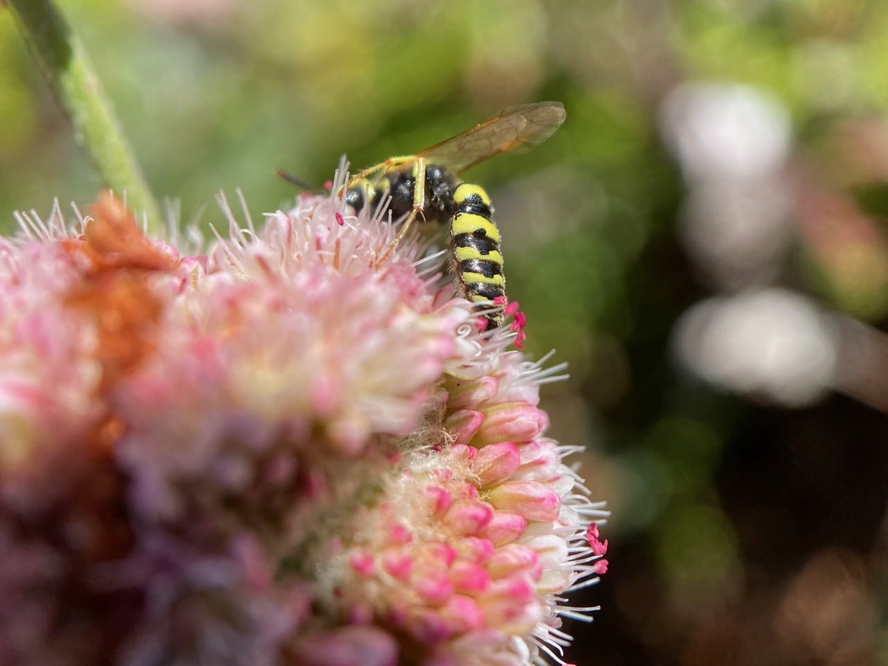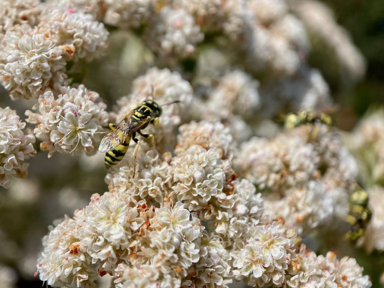 A quick swipe of its antenna and the Cuckoo Bee is off to another cluster of flowers.