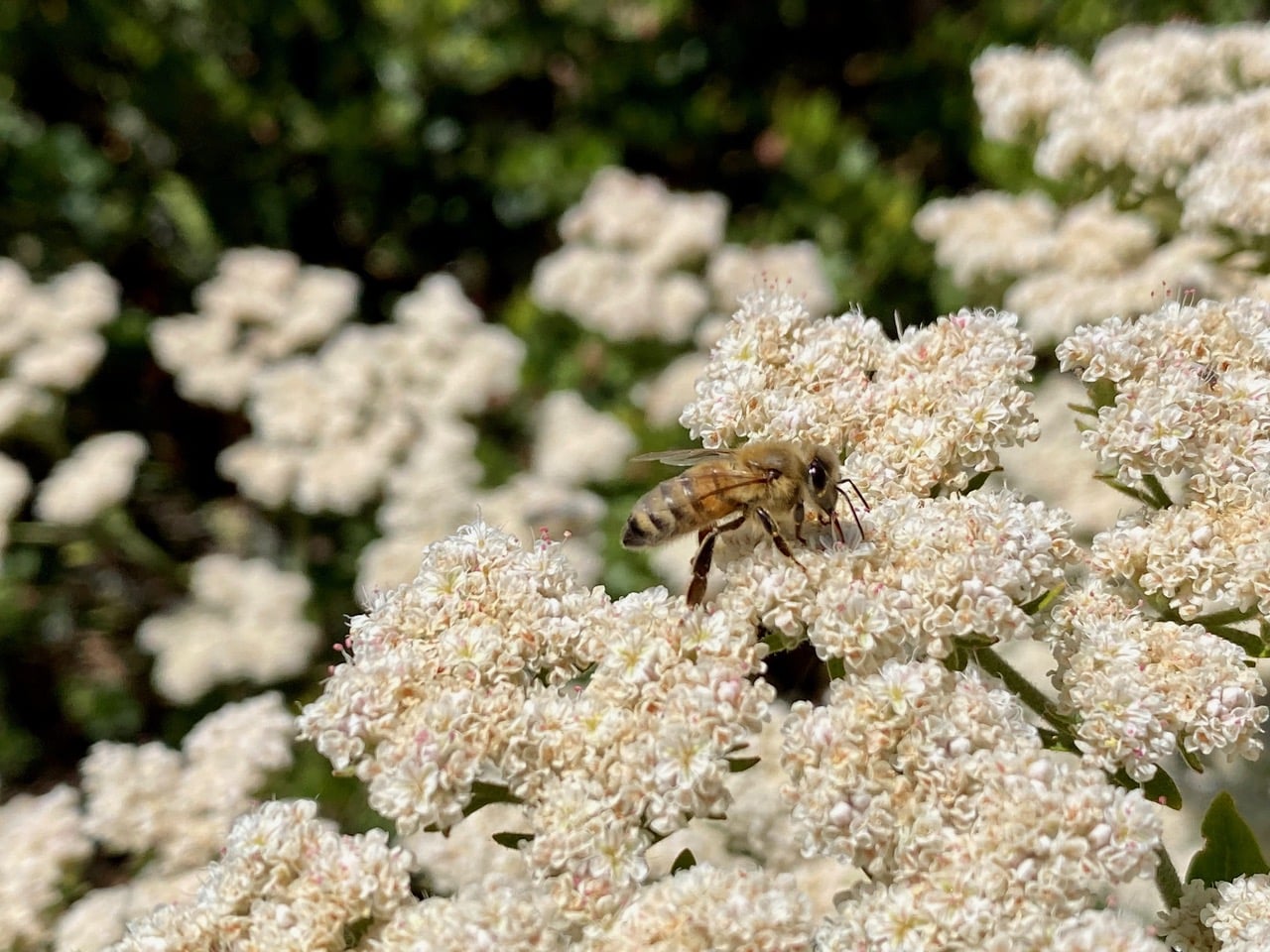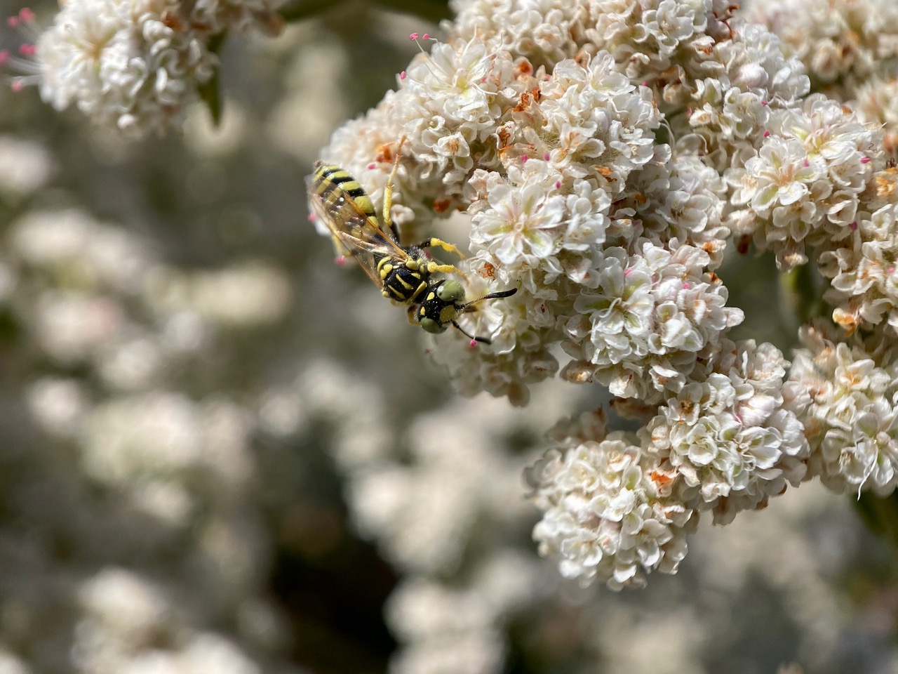 The large shrubs of St. Catherine’s Lace, Eriogonum giganteum near the visitor center are a center of insect activity right now. The Honey Bees, Apis mellifera (family Apidae) seem to be the most prevalent among the visitors to the small, densely clustered flowers.