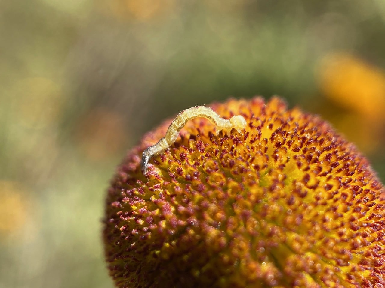 A tiny inchworm caterpillar is “inching” its way on the surface of a globular flowerhead of Sneezeweed, Helenium puberulum.