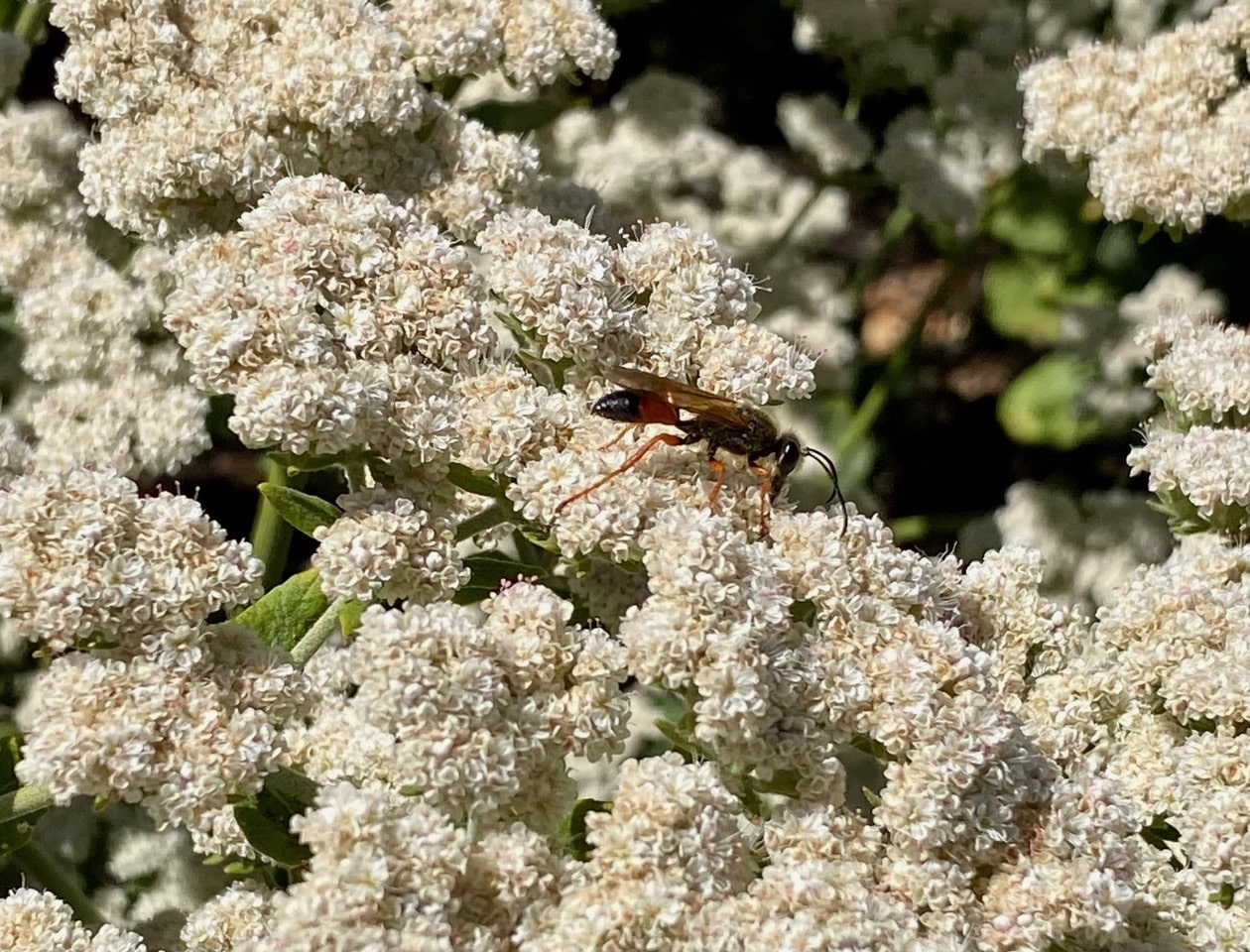 A Large wasp is making its way around the large masses of flowers of St. Catherine’s Lace, its head down constantly seeking nectar. It is a Great Golden Digger Wasp, Sphex ichneumoneus (family Sphecidae).