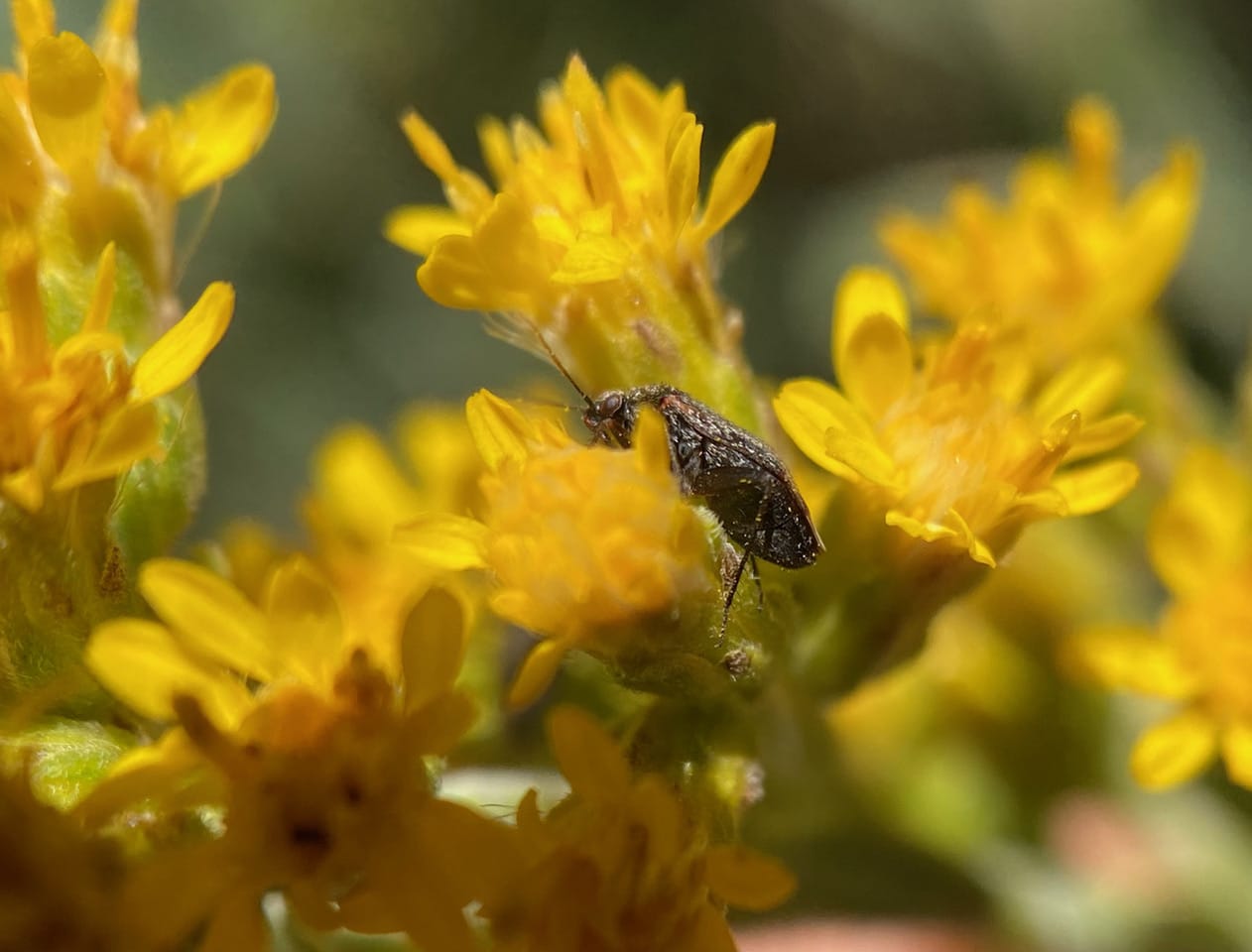 A dark insect is moving around among the flowers of the California Goldenrod, Solidago velutina ssp. californica. It is a Black Grass Bug, Irbisia sp. (family Miridae).