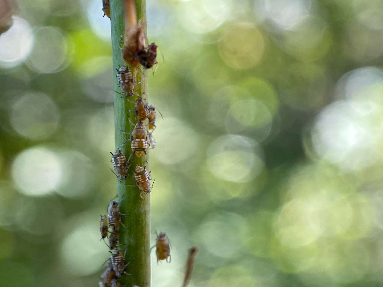 Many of the young aphids are developing into alates, as evidenced by the wing pads on the nymphs. There’s going to be a mass exodus from this plant.