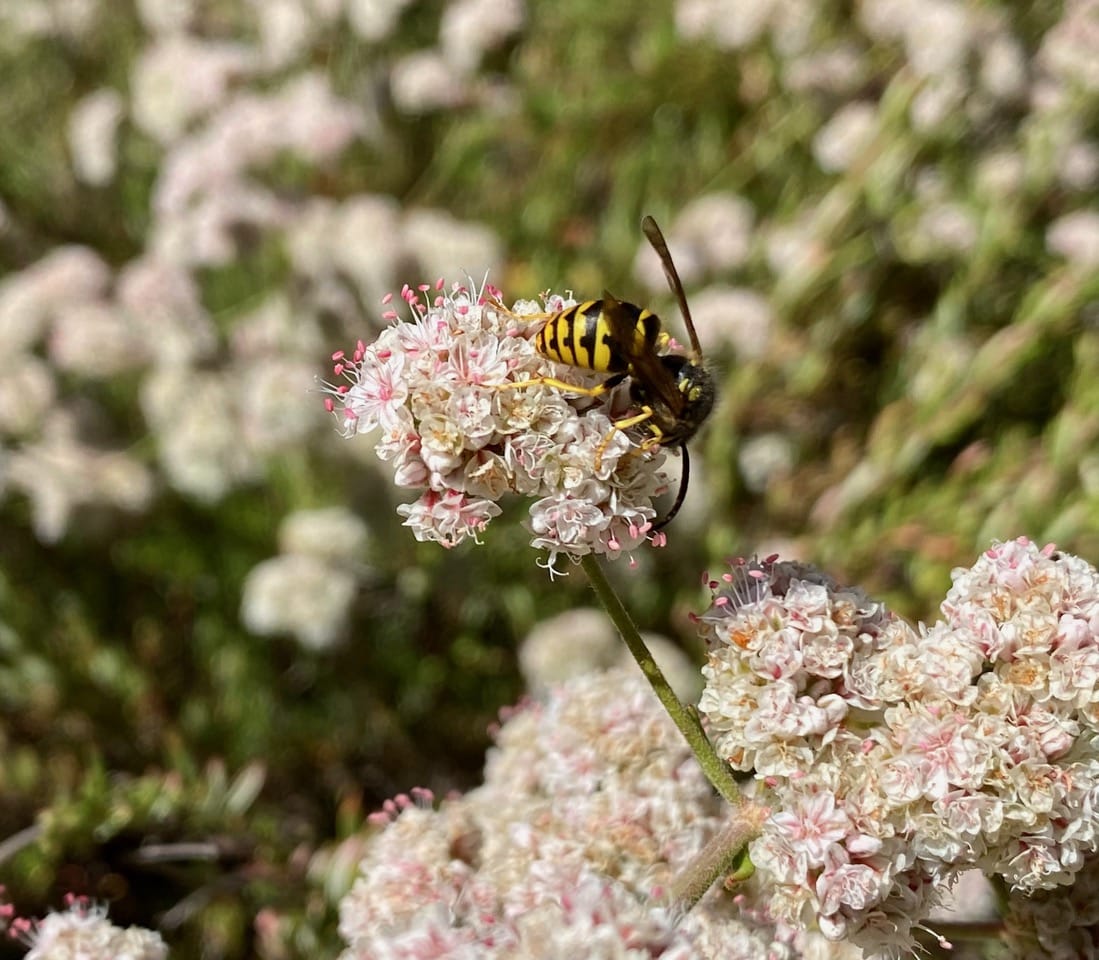 A Yellowjacket wasp is foraging on an inflorescence of California Buckwheat.