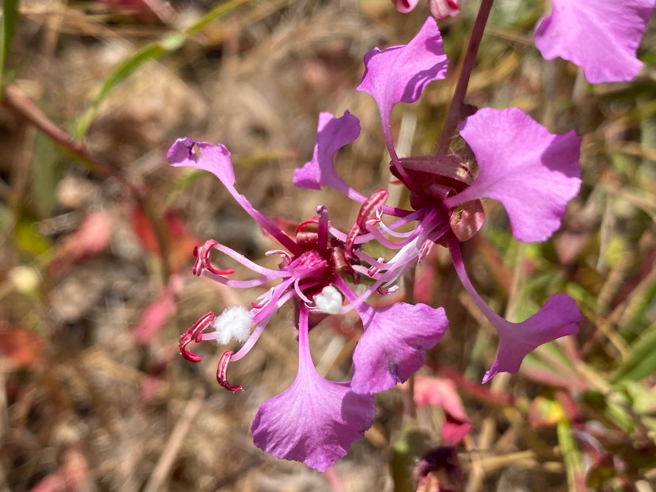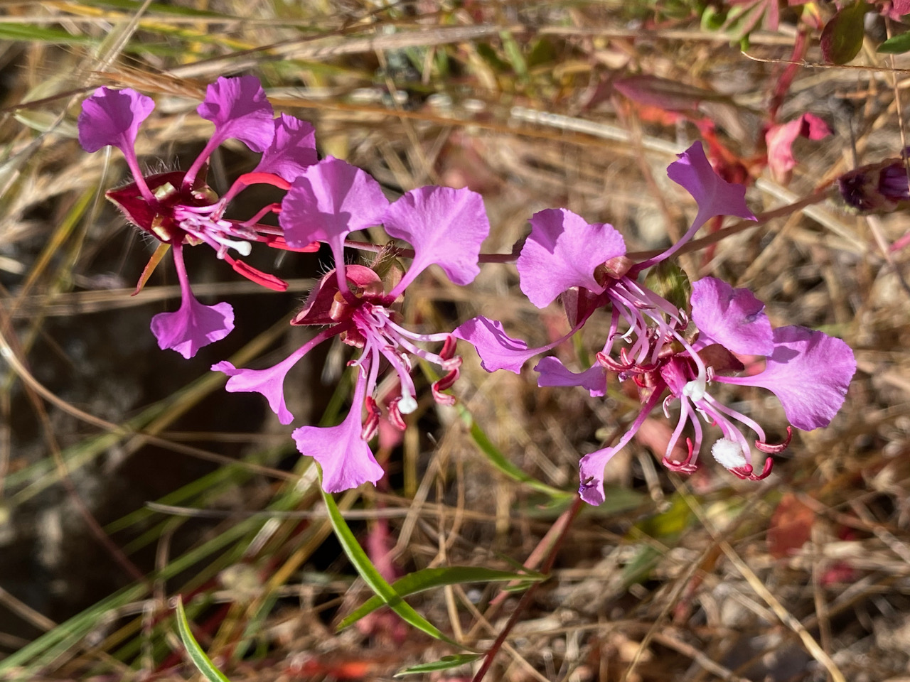 I am delighted to see the Elegant Clarkia because historically it has occupied a prominent place in the study of pollination. It displays a pollination strategy involving flowers with two distinct sets of anthers that differ in color, size, and position. The phenomenon, called heteranthery has puzzled Charles Darwin to his dying days. In 2021, a research team at UCSC showed that heteranthery in Clarkia is a way for flowers to gradually dole out their pollen to bees over multiple visits as the anthers open at different times.