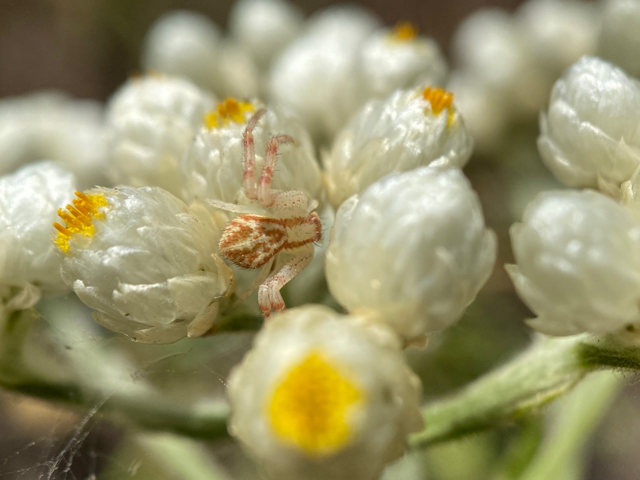 A young Crab Spider, Mecaphesa sp. (family Thomisidae) is waiting in ambush among the blooming flowerheads of California Everlasting, Pseudognaphalium californicum.