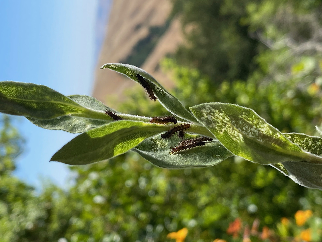 The little black caterpillars on the California Goldenrod, Solidago velutina ssp. californica seem to have spread among neighboring plants, devastating and killing quite a few. The munched leaves curl up around the stem, turn brown and dry up. I never see any caterpillars bigger than this size, so apparently they are a small species (probably of a moth?). I don’t find any cocoons on the plants, so the mature caterpillars probably pupate in the ground or leaf litter? The caterpillar is probably specific to the goldenrod, as I don’t see them on any other plants in the vicinity. The only way to resolve the mystery is to rear these caterpillars to adulthood. But that means having to harvest the plants, which we don’t have that many of here….