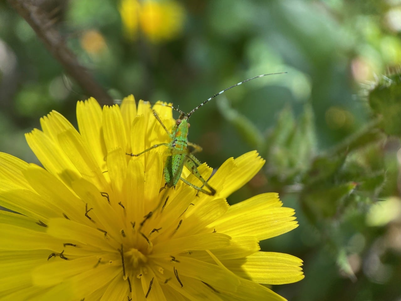 A nymph of Scudder’s Bush Katydid, Scudderia sp. (family Tettigoniidae) is perched on a Bristly Oxtongue flowerhead.